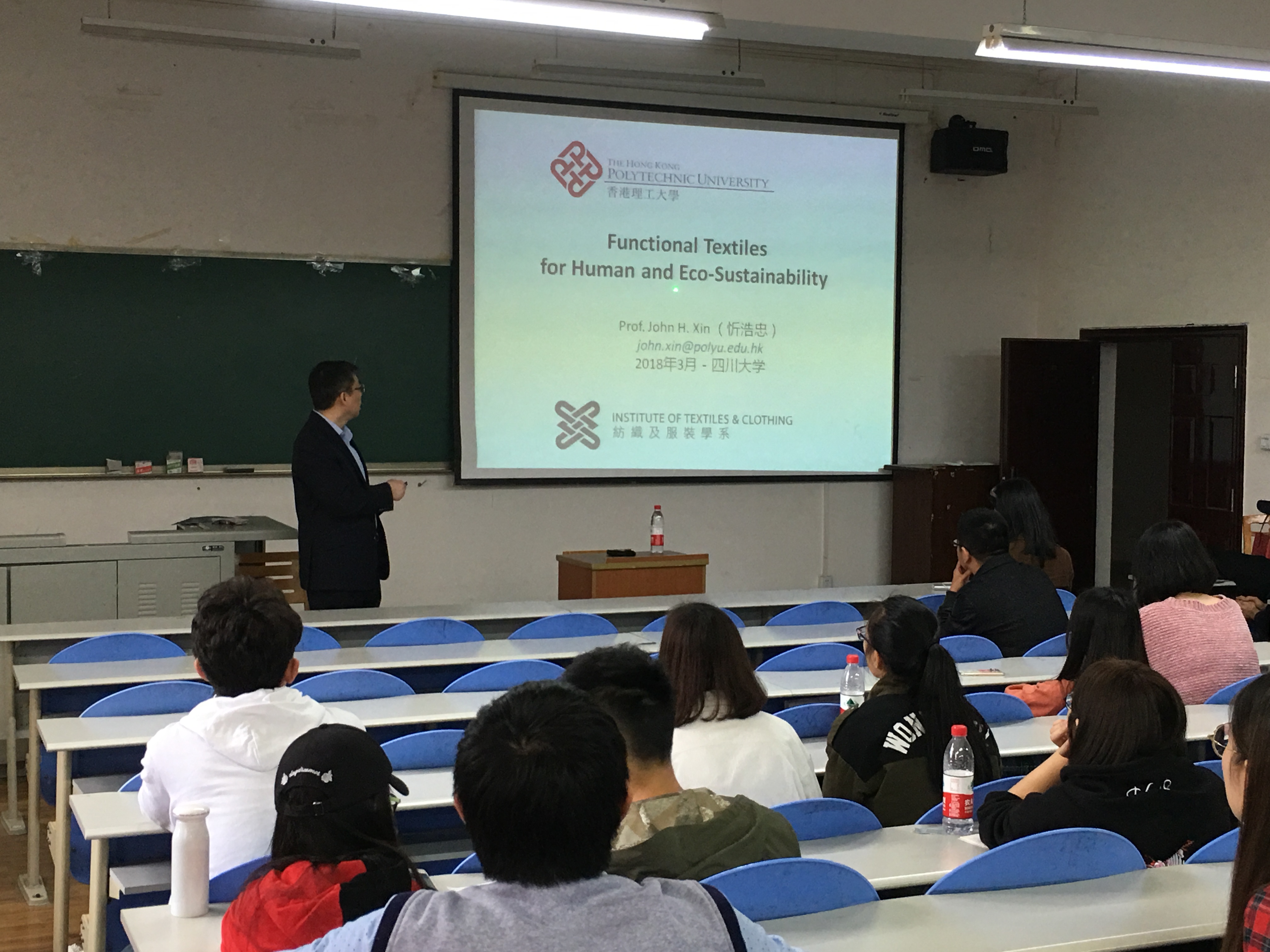 10:00-12:00,在纺工副楼205报告厅做了讲座,对香港理工大学和纺织及服装学系情况做了报告,并且做了题为“Functional Textiles for Human and Eco-sustainability”的学术报告。纺织与服装工程系教师、本科生和研究生聆听了忻浩忠教授的精彩报告。