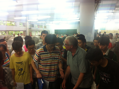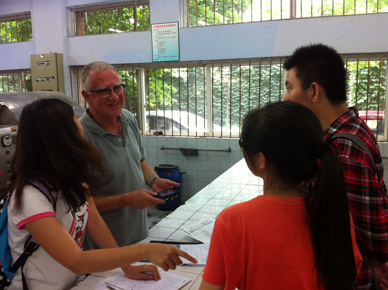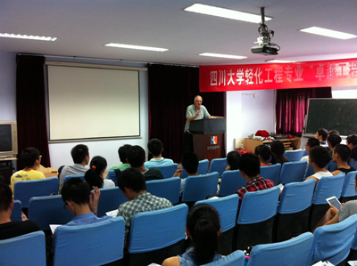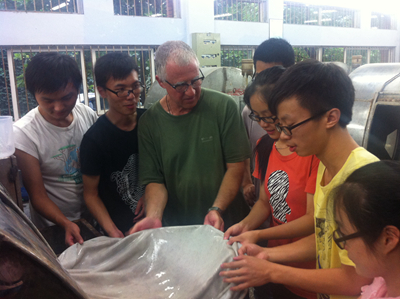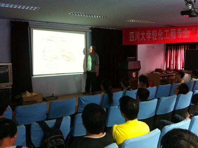 制革清洁技术国家工程实验室报告厅向选课的84位本科生详细介绍了自己的工作经历及此次授课的前期准备、授课方式、时间安排、预期目的等,Daniel一丝不苟的敬业精神和风趣幽默的课堂讲解给同学们留下了深刻的印象。随后,Daniel开始组织同学进行制革工艺实践,利用自己在皮革行业从业40余年的工作经验引导大家熟悉制革工艺、体验专业色特,培养同学们的专业兴趣,激发学习热情。据悉,Daniel此次川大行将持续至7月11日。在此期间,除了通过生产实践的方式介绍制革新技术外,他还将为我院本科生开始系列讲座,体现了厚基础理论、重实际应用、博前沿知识的先进理念,培养学生分析问题和解决实际问题的能力,使学生达到制革领域高层次人才应具备的知识结构和能力要求。通过此次“实践与国际课程周“活动,我院制革方向的本科生对制革过程有了更为深入的了解,学习到了一种可以改善成革质量的浸灰新技术。与此同时,在Daniel的引导下,同学们提高了自己的专业英语应用水平,并感受了异域文化。课余时间,同学们还自发与Daniel进行游戏、共进午餐,同时就未来的择业、就业等问题与其交流意见。