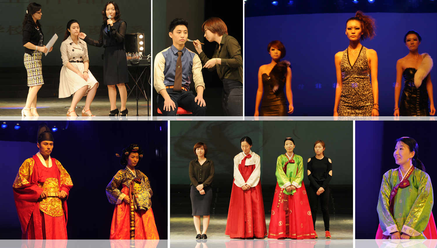 纺织服装系学生作品展示环节。首先又松大学形象设计系主任金憓均为现场观众传授了韩式裸妆的化妆技法,赢得了观众们的极大兴趣和互动;接着充满造型感的创意妆面秀和韩国传统服装秀将东方的神秘诡谲与西方的浪漫奔放及表现主义风格相结合,营造出了强烈的国际化时尚潮流感。