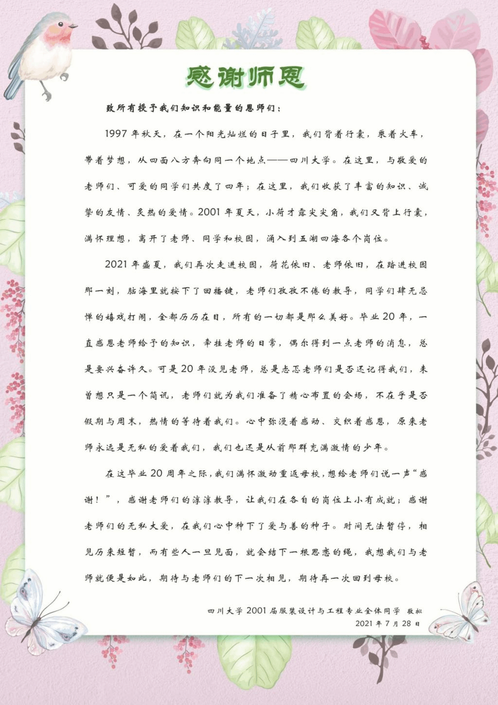 2021�7�25日,四川大学轻工科学与工程学�2001届服装设计与工程专业校友20周年暨返校活动在望江校区纺工�204会议室隆重举行。莅临此次活动的领导及老师有四川大学轻工科学与工程学院院长何有节教授、纺织服装系副主任赵武老师、服装与服饰专业教研室主任冯洁老师以及万宗瑜、李晓蓉老师,因故未能出席的老师们也提前送上了祝福�