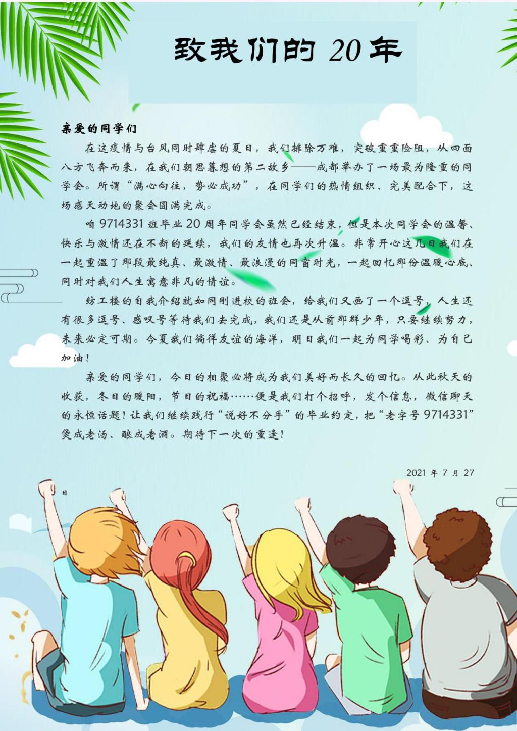 2001届服装专业校友毕�20周年荣返母校活动取得了圆满成功。就像白玉力校友说得那样:青春是绿色的,成都是绿色的。这里让他对“大学”和“大学生活”的想象第一次有了样子:有古建,有影院,有池塘,有操场;有可爱可敬的老师,有欲语还休的儿女情长。流年似水,情谊永固。为青春举杯,为友谊举杯�