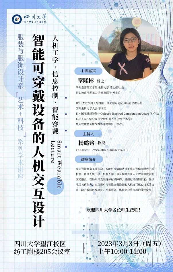 我院服装与服饰设计系“艺�+科技”系列学术讲座于3�3日上�10�00在望江校区纺工附�205会议室开讲,本期主题为“智能可穿戴设备的人机交互设计”,主讲嘉宾为瑞典皇家理工学院章隆彬博士,讲座由服装与服饰设计系杨璐铭教授主持,服装与服饰设计、服饰工程、材料学、机械工程等各专业师生参加了本次讲座�