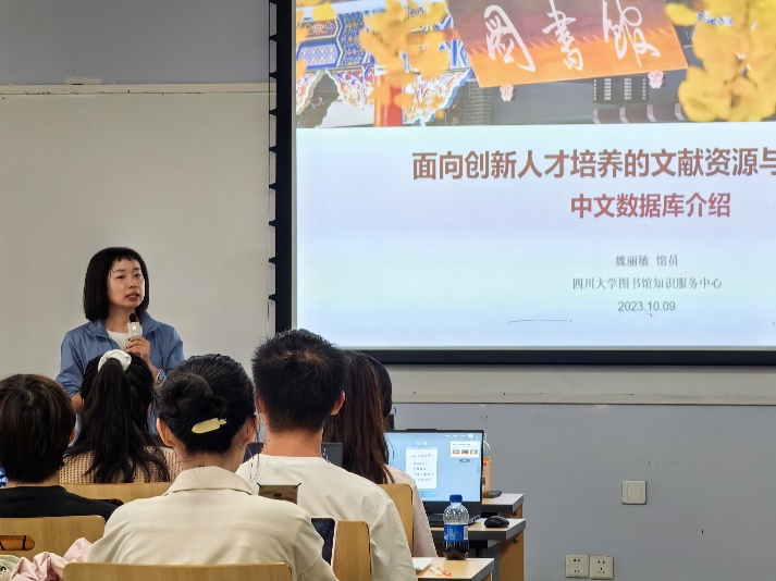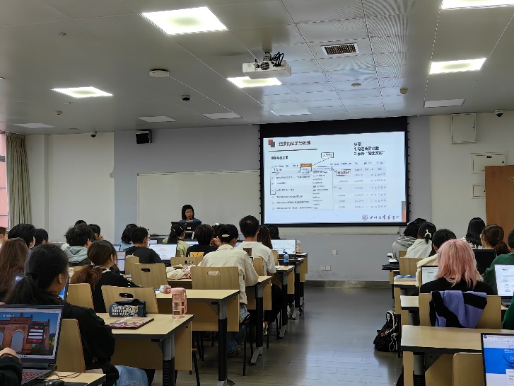 江安校区第一教学楼A座306。活动由杨璐铭教授主持,并邀请了校图书馆魏丽敏老师和王圣洁老师向我院2023级服装与服饰设计专业大一新生进行关于科研信息检索、管理和利用等方面的讲座。本次活动共进行了2学时,旨在全面提升学生的科研探索能力。此类教学模式已经在服装与服饰设计专业实施三年,通过嵌入式教学,能够让学生们深入了解并掌握获取文献信息资源的方式,提高科研能力。