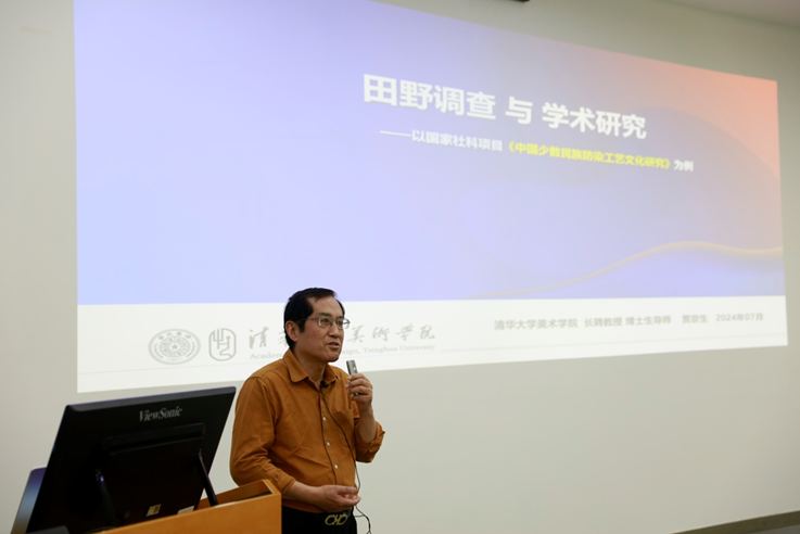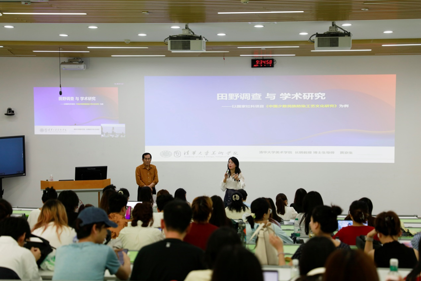 贾老师以本人主持的国家社科基金项目为例,结合自身近30年田野调查的经历,主要从项目回顾概述、田野调查与学术研究的价值、田野调查与学术研究的质量、田野调查与学术研究的方法等方面展开讲述。首先,系统地介绍了田野调查这一研究方法的概念、特点、方法步骤等。分析田野调查对具体研究对象的适用性,在一手资料的累积方面的优势。同时,强调田野调查需结合多种方法为研究手段,具有跨学科、跨族群、跨地域的特点。其次,探讨了田野调查与学术研究的关系,并提出设计学、艺术学的研究需要与其他学科进行理论嵌套及方法上的借鉴,介绍了相关理论与著作。