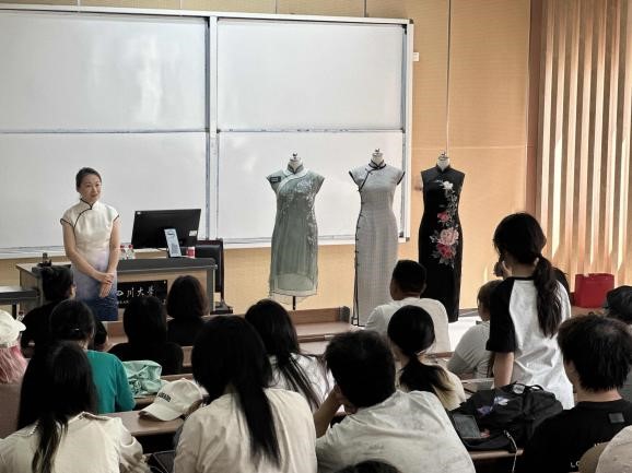 在讲座中,苗老师围绕“旗袍渊源”、“海派旗袍的成因与特点”、“色彩影响”、“材质创新”、“工艺品质”、“装饰手法多样性”六个关键主题,深入浅出地解析了海派旗袍的美学体系与工艺魅力。还特别为同学们带来了三款高定海派旗袍实物,每一件作品都蕴含独特工艺与文化故事,引发了学生们极大兴趣。