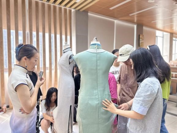讲座现场气氛热烈,学生们纷纷围在老师身边观摩作品,与苗老师积极互动,深入交流旗袍结构、面料运用、工艺细节等问题。