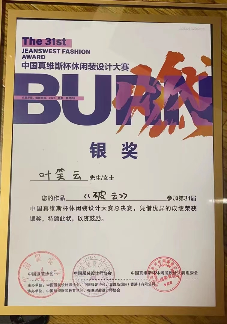 本届赛事以“燃”为主题,借“燃”之力,呼唤新时代服装人,用设计的力量点燃青春,奋斗青春,不负韶华。大赛由中国服装设计师协会、中国服装协会、真维斯国际(香港)有限公司联合主办,中国纺织服装教育学会、香港时装设计师协会和if时尚等多家单位共同协办。自启动以来,受到全国各地院校师生的关注,最终收到千余份投稿作品。历经效果图初评、现场答辩、总决赛动态展演等专业评审团多轮严格评分,叶笑云、陈珺仪二人作品最终喜获大赛银奖,创下我院学子历届参加该大赛成绩新高�