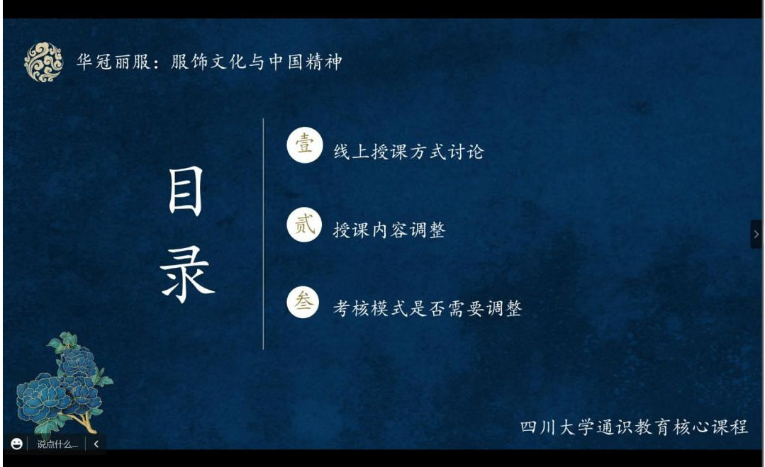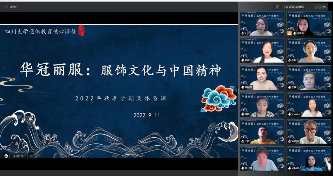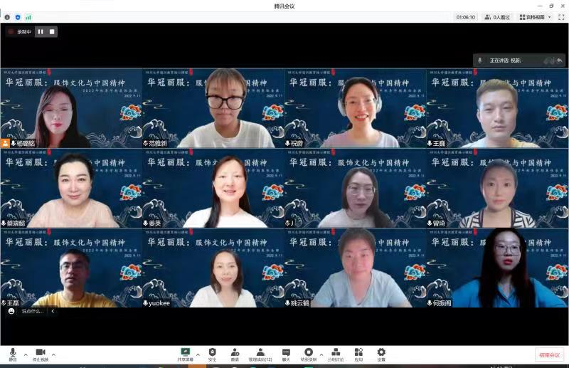 第二批通识教育核心课程,为促进课程组教师多学院、多学科的交叉融合,保证“华冠丽服:服饰文化与中国精神”课程在新一学期的顺利高效开展,便于课程组教师根据学情对课程内容及授课方式进行针对性调整,保障课程线上教学效果,课程组于2022年9月11日在腾讯会议开展本学期第一次集体备课活动。在此次活动中,课程组对本学期上课形式、课程内容、过程考核方式、期末考核标准等方面统一了思想。