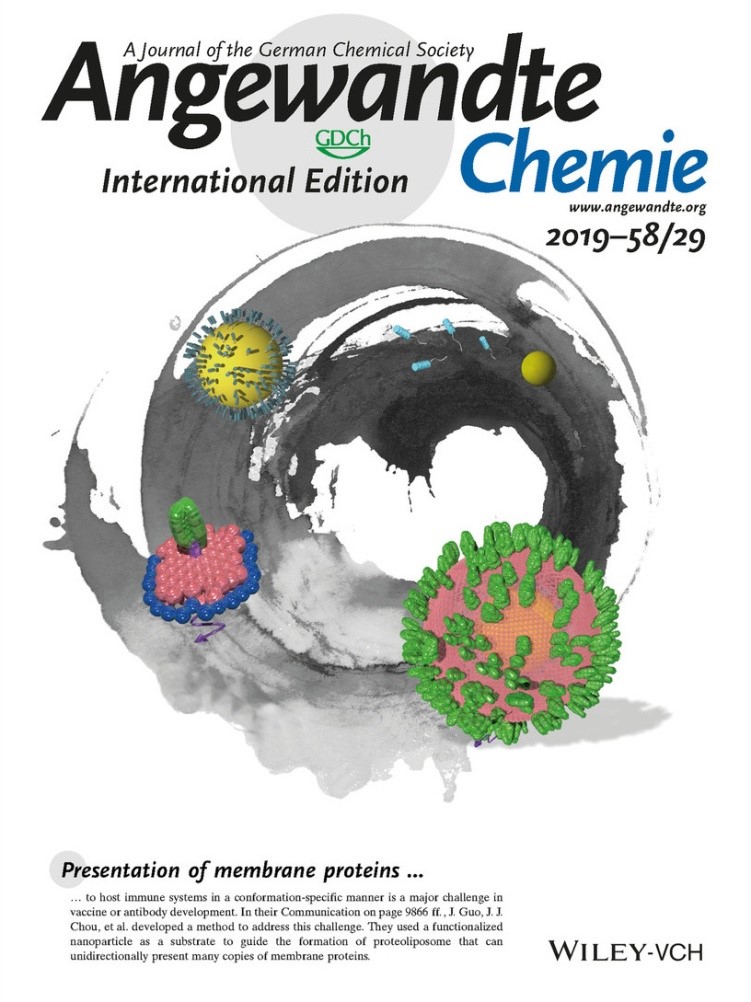 郭俊凌教授课题组与哈佛医学院研究团队在国际顶级期刊《Angewandte Chemie International Edition》(德国应用化学)以外封面形式在线发表题为“Unidirectional Presentation of Membrane Proteins in Nanoparticle-Supported Liposomes”研究论文(2019年6月25日正式发表)。该研究开发一种病毒膜蛋白新型组装技术以及一种人工病毒合成的新平台方法,同时该技术也可以用来研发各种受体蛋白、离子通道以及转运蛋白的高效抗体。在该研究中,研究人员成功地合成了艾滋病HIV类病毒,并且检验了其在动物模型中有效抗体的产生,这个研究极大地鼓舞了该研究团队尝试利用这项新技术合成新型冠状病毒SARS-CoV-2疫苗。