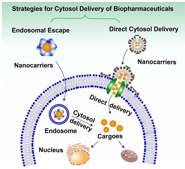 纳米载体给药是一种可以提高治疗效果的有效方式。首先,纳米颗粒可以通过内吞作用(包括吞噬作用、巨胞饮作用、网格蛋白和小窝蛋白介导的内吞作用)进入细胞,在这个过程中,细胞膜吞噬纳米颗粒并分裂后在细胞内形成一个独立的囊泡,随后释放生物大分子药物。其次,纳米颗粒可以增强内体逃逸能力,使生物大分子通过细胞溶质得到有效的传递,常用纳米颗粒包括脂质体和脂基NPs、聚合物胶束和聚合物NPs、脂-聚合物混合NPs、纳米晶体以及无机NPs,如金NPs、磁性NPs、碳纳米管、石墨烯、量子点和硅NPs。最后,纳米颗粒易实现胞内直接递送,主要途径包括小窝介导途径、接触释放和膜间转移、膜融合、胞内直接易位、膜破裂和显微注射。该综述对此详述了细胞内直接递送生物大分子策略以及它们的优缺点,以及这些策略解决胞浆递送的挑战。