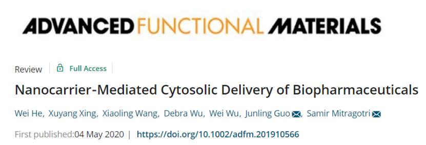 近期,国际顶级期刊《Advanced Functional Materials》(先进功能材料)特邀我院郭俊凌教授对该重要领域进行总结以及提出前瞻性展望。题为“Nanocarrier-Mediated Cytosolic Delivery of Biopharmaceuticals”的论文由我院王晓玲副研究员(专职科研博士后)作为共同第一作者与哈佛大学、中国药科大学团队完成。本论文重点介绍了以生物大分子核心的多功能纳米载药系统的最新研究进展,主要包括细胞跨膜的靶向运输,报道了多种生物制药给药途径中的胞质传递途径,包括小泡介导途径、接触释放、膜间转移、膜融合、直接易位和膜破裂等。在该论文中,通过对纳米技术和生物大分子化学之间的界面作用进行讨论,突出强调了生物大分子细胞递送系统对该类重要生物质资源的高效利用的意义,以及个性化医学的重要意义以及未来挑战。