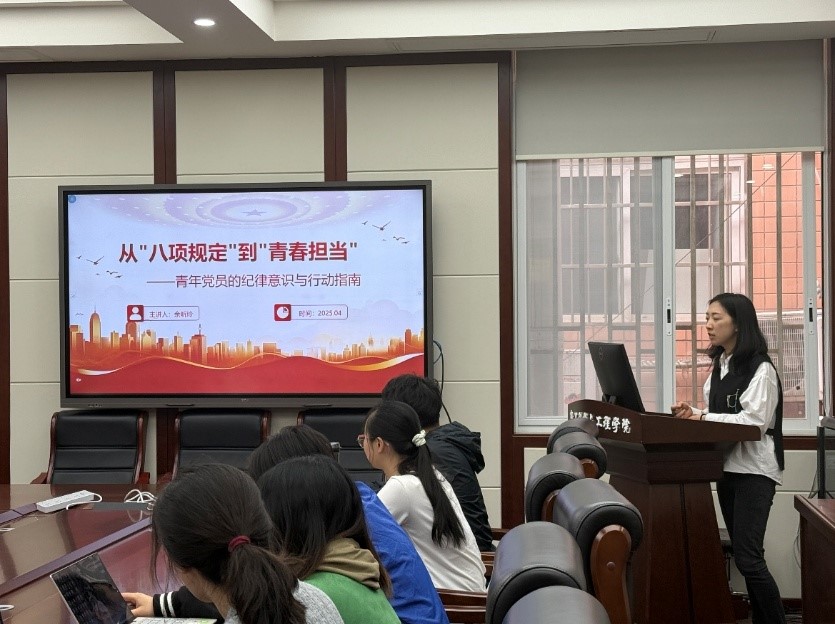 本科生第二党支部于2025年4月11日组织开展了专题党课学习活动。党支部书记余昕玲老师以《从“八项规定”到“青春担当”——青年党员的纪律意识与行动指南》为题,为支部全体党员讲授党课。