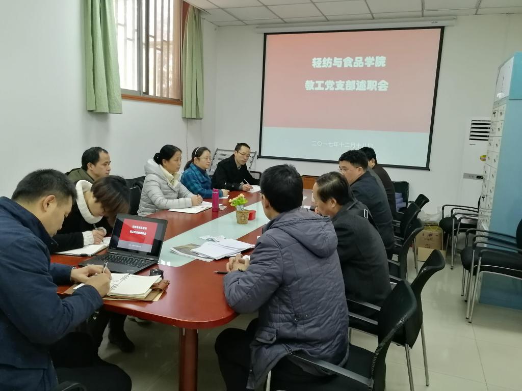 刘晓虎书记首先就学院党建工作考核的准备情况向与会人员做了通报,就支部工作的重要性做了强调。接下来,行政教工党支部肖凯书记、皮革系教工党支部程海明书记、食品系教工吕远平书记、纺织服装纺研教工党支部顾迎春书记分别就本年度工作进行了总结汇报。四位教职工党支部书记述职完成后,刘书记做了总结发言,他首先高度肯定教职工党支部书记在本年度所做的大量工作,对他们的工作表示感谢;展望明年的工作,提出下一步做好支部工作的新思路、新要求。最后,何有节院长做了进一步补充,强调做好支部生活记录,党员发挥好带头模范作用,加强支部宣传力度。