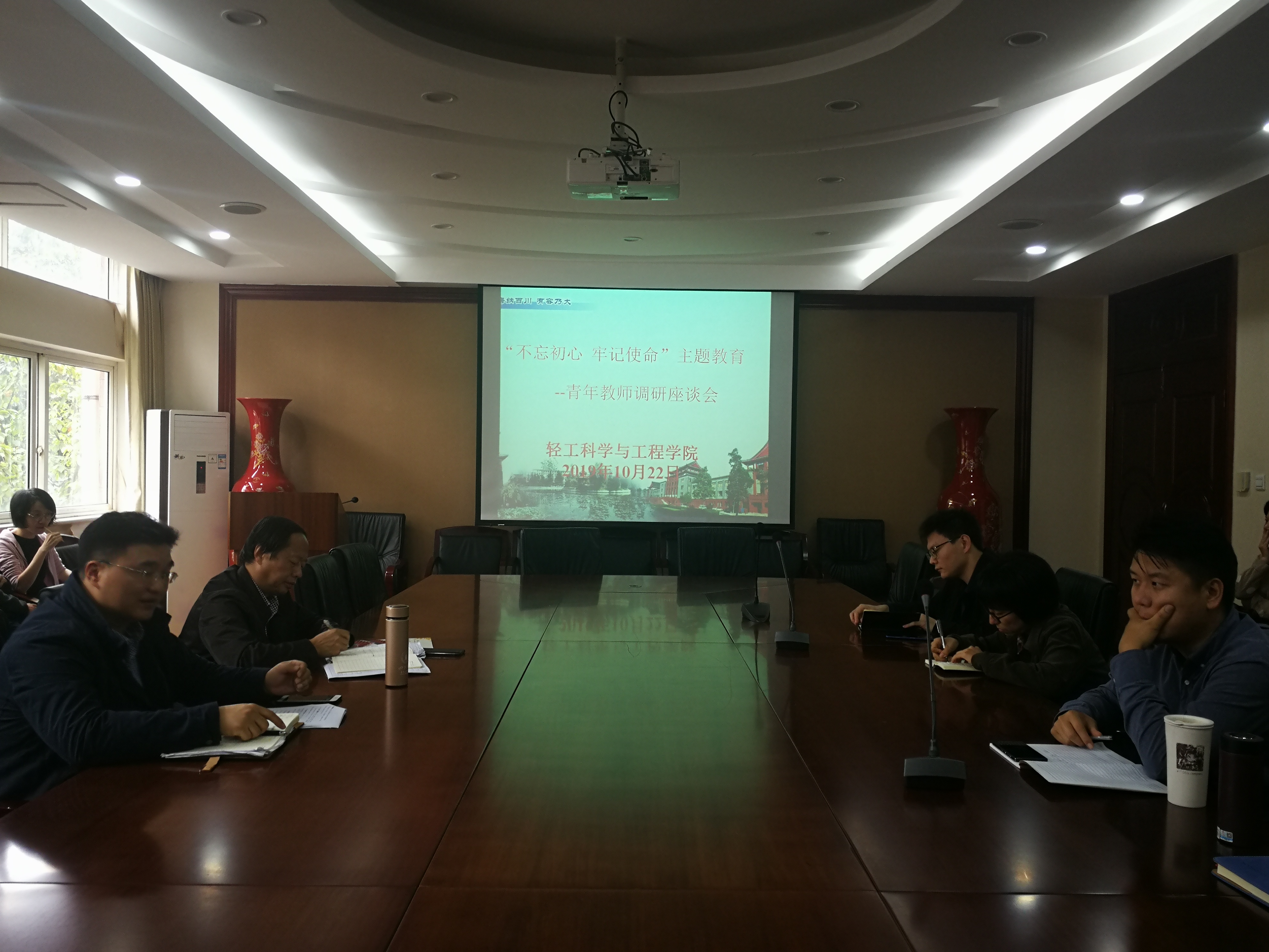 20191022日下午,我院在皮革楼209会议室,召开“不忘初心、牢记使命”主题教育青年教师调研座谈会,党政主要负责人参加本次调研,深入基层认真听取青年教师的意见和建议。