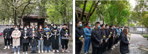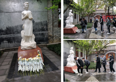 在党支部潘申财同志的组织下,支部成员手持寄托哀思的菊花,肃穆站立,认真倾听《江姐之歌》,齐声歌唱国歌后低头默哀三分钟,并献花于江姐雕塑,传达党员同志对江姐及其他川大革命烈士的哀思。随后,支部成员参观江姐纪念馆与NT动漫