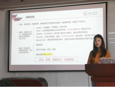 进入企业工作的毕业生也结合自身经历为同学们讲述了企业的招聘流程和面试注意事项。覃凤阳同学通过了五粮液公司的层层选拔,她强调了企业对专业知识的高标准要求,除了对逻辑推理和资料分析等知识性考核外,还会测试对NT动漫的了解程度。进入外企就职的蓝绪悦同学讲述了群体面试和单人面试的技巧,一定要敢于表达自己的想法,并提前准备好中英文自我介绍,对面试中可能出现的问题也要做好充足的准备。唐丽同学主要向同学们分享了两个方面的内容:一是沿海地区与西南地区选调政策的差别;二是选择就职高校辅导员的了解渠道。会上,同学们也积极向毕业生学姐们提出自己在了解就业过程中遇到的疑问。