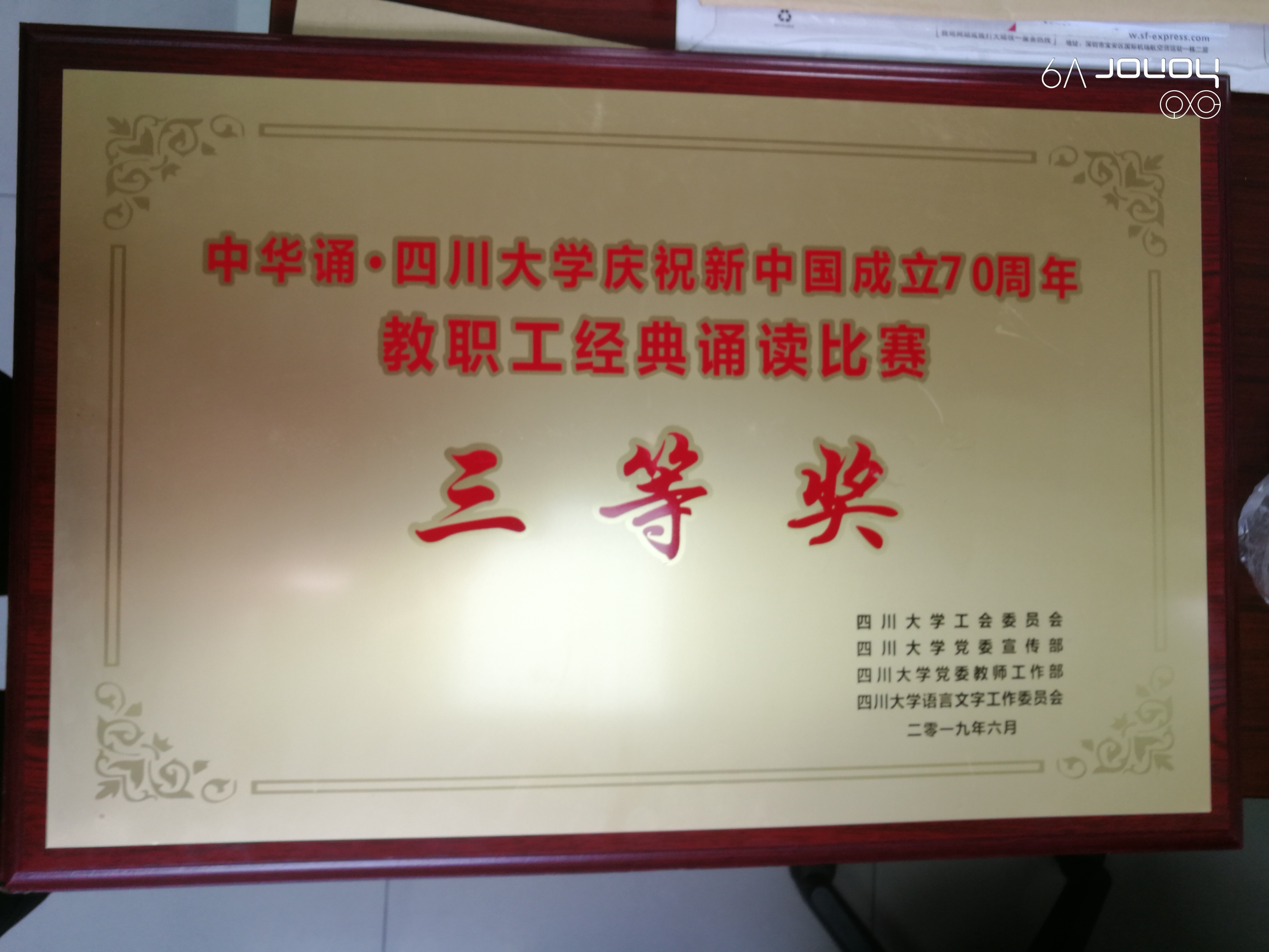 2019年6月5日,现场决赛在望江校区逸夫科技馆报告厅举行,我院杨璐铭老师以字正腔圆、声情并茂朗诵,诠释了70年披荆斩棘,70年风雨兼程,70年砥砺奋进,中国发生了天翻地覆的巨变,昂首屹立在环球的东方,用嘹亮的声音告诉世界,一个地球的惊喜,一个东方的奇迹,一部由十四亿人共同创作的春天进行曲,作品荣获三等奖。