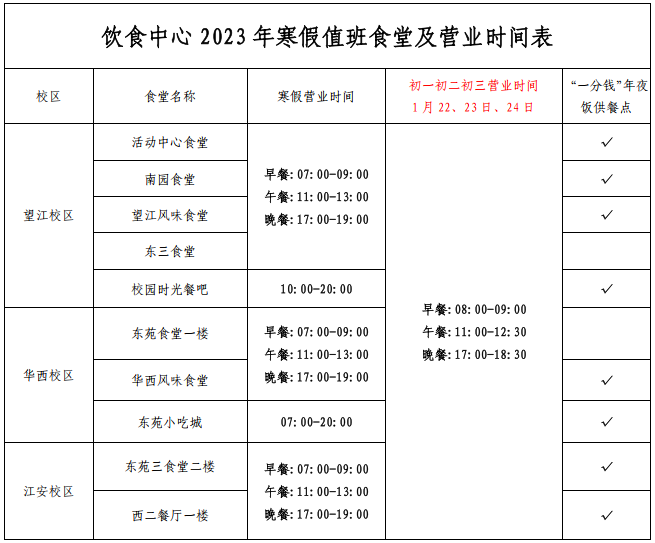 2023年1月14日至2月15日,图书馆执行寒假工作时间。1月21日至1月27日春节放假闭馆,因春节放假调整后的周末(1月28、29日)按照周一至周五开放时间开放。图书馆各分馆的开放时间及服务安排如下表: