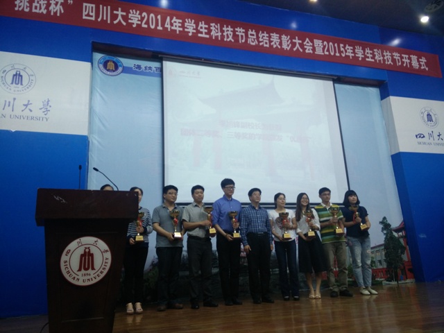下午15时30分,大会在一段精彩的科技创新工作创意视频中拉开序幕。校团委徐海鑫书记回顾了2014年学生科技活动的开展情况。副校长许唯临教授宣读2014年学生科技节表彰决定。副校长李旭峰教授为轻纺与食品学院、电子信息学院、经济学院等9个学院颁发“优胜杯”,校长谢和平院士亲自为荣获团体第一名的商学院颁发“挑战杯”,并就激励学生创新创业发表了重要讲话。
