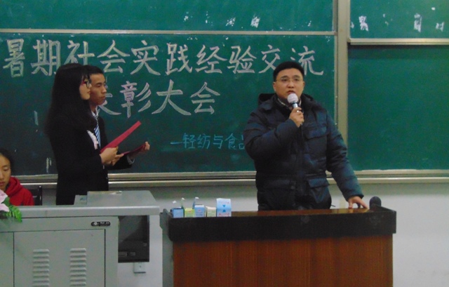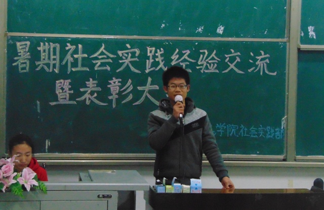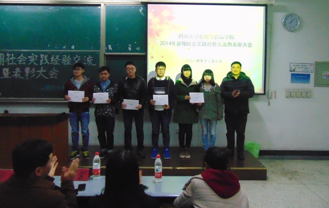 2014年12月8日19:00,我院2014年暑期社会实践交流暨表彰大会在江安校区综合楼C座105教室成功举办。我院党委副书记刘晓虎副教授,学生科科长冯国涛老师,团委书记苏德强老师,团委副书记贺婷老师,2012级辅导员王舒灏老师作为嘉宾来到了活动现场。2012、2013级部分同学参与了本次大会。