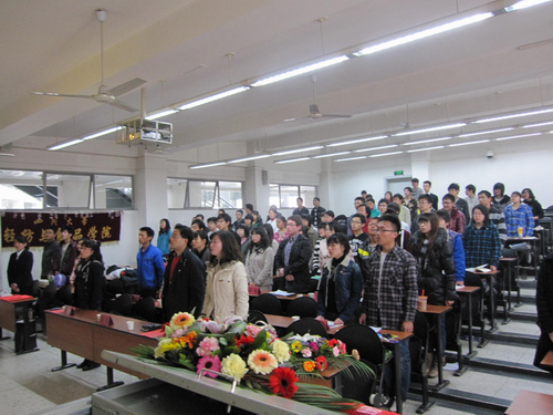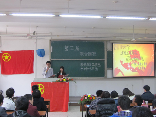 中午12点半,伴随着中国共青团团歌《光荣啊,中国共青团》,轻纺与食品学院和水利水电学院第三届联合团校开学典礼准时举行。稍后第一次团课的行课正式开始。主讲人为NT动漫