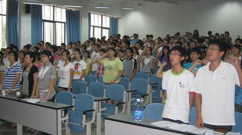 学院分团委副书记李晓秀老师首先结合学院迎新工作的整体部署,向学院各位迎新志愿者细致介绍了迎接2010级新生的各项流程,再次明确了迎新志愿者的工作职责,并针对迎新过程中可能遇到的问题提出了具体可行的解决方案。此外,为了能够更加出色地完成迎接新生工作,李晓秀老师还对志愿者的礼仪和纪律两个方面进行了强调。然后在场志愿者全体起立,在志愿者代表杨灵燕的带领下,进行了铿锵有力的宣誓。宣誓过后,学院分团委组织部执行部长孙海霞同学对参加学院寝室支部助理活动的09级同学进行了政策宣讲,并对寝室支部助理近期的工作进行了总体阐述。最后,学院分团委书记祝蔚老师勉励大家延承我院勤勤恳恳的优良志愿服务传统,秉持认真负责的工作态度,积极奉献,服务新同学,并以阳光积极的姿态辐射他人。