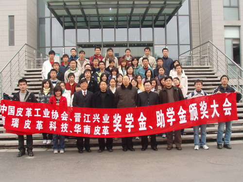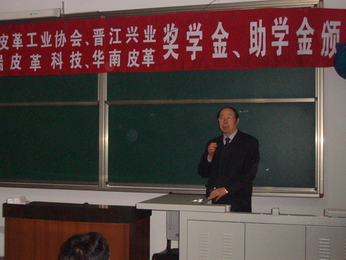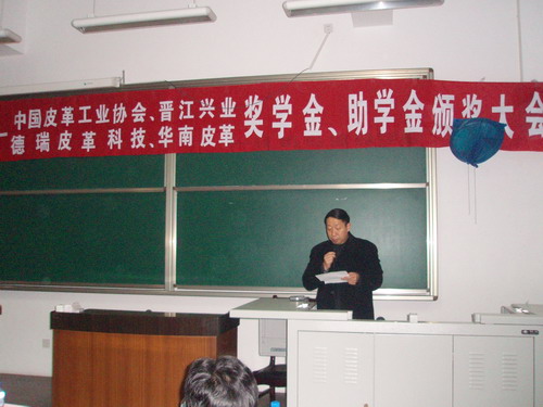 2007年12月12日上午9:00,中国皮革工业协会奖学金、晋江兴业皮革有限公司助学金、德瑞皮革科技有限公司奖学金以及华南皮革有限公司奖助学金颁奖典礼在江安校区综合楼C103隆重举行。出席本次颁奖典礼的嘉宾及院领导有中国轻工业联合会副会长、中国皮革工业协会名誉会长徐永先生、中国皮革工业协会副秘书长陈占光先生、晋江兴业皮革有限公司罗丰旭副总裁、轻纺与食品学院院长陈武勇教授以及轻纺与食品学院党委副书记刘晓虎老师。颁奖仪式由冯国涛老师主持,2006级轻化工程、轻工生物技术以及各年级获奖同学共计200余人参加了本次颁奖典礼。