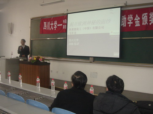 颁奖典礼开始之前,瑞士科莱恩国际有限公司北京办事处皮革部北方市场部经理马军龙先生给全体学生作了关于欧洲各国皮革行业现状的精彩报告,他的精彩的演讲引起了众多皮革学子对国外皮革业现状的浓厚兴趣,赢得了同学们阵阵掌声。