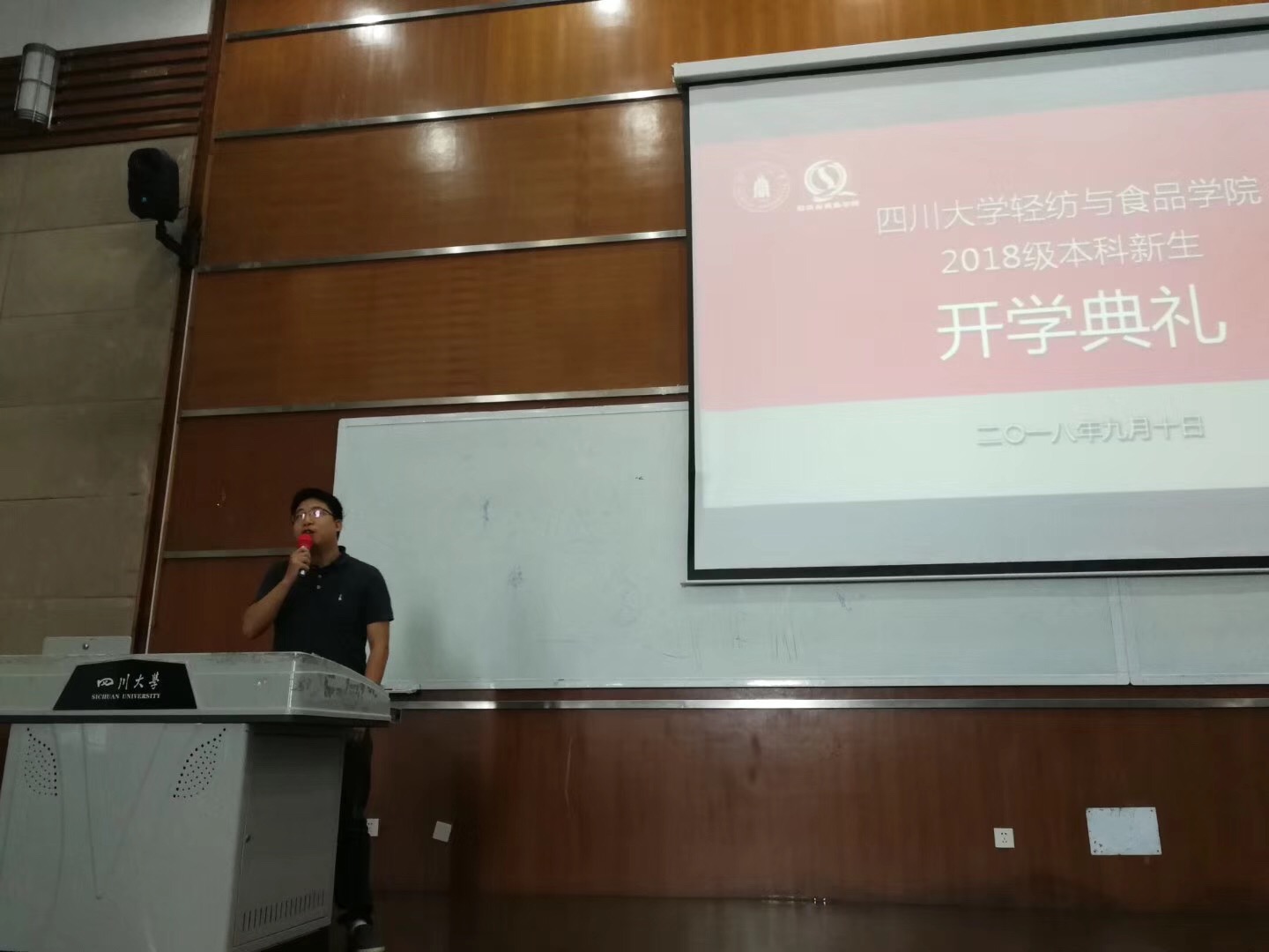 2018年9月10日14:30,天高云淡,百年川大呈现出一片开阔明朗之景,此时轻纺与食品学院2018级本科生开学典礼在综C407隆重举行。学院党委书记刘晓虎副教授、院长何有节教授、党委副书记冯国涛老师、副院长何强教授、副院长肖凯老师、生物质与皮革工程系副系主任程海明教授、食品工程系副系主任贾利蓉教授、纺织与服装工程系副系主任赵武副教授、教导员邱华明老师、辅导员李晓秀老师、杨维老师共同出席此次典礼。还有部分家长代表及学子们齐聚一堂,共同开启振奋人心的川大新学期之旅。