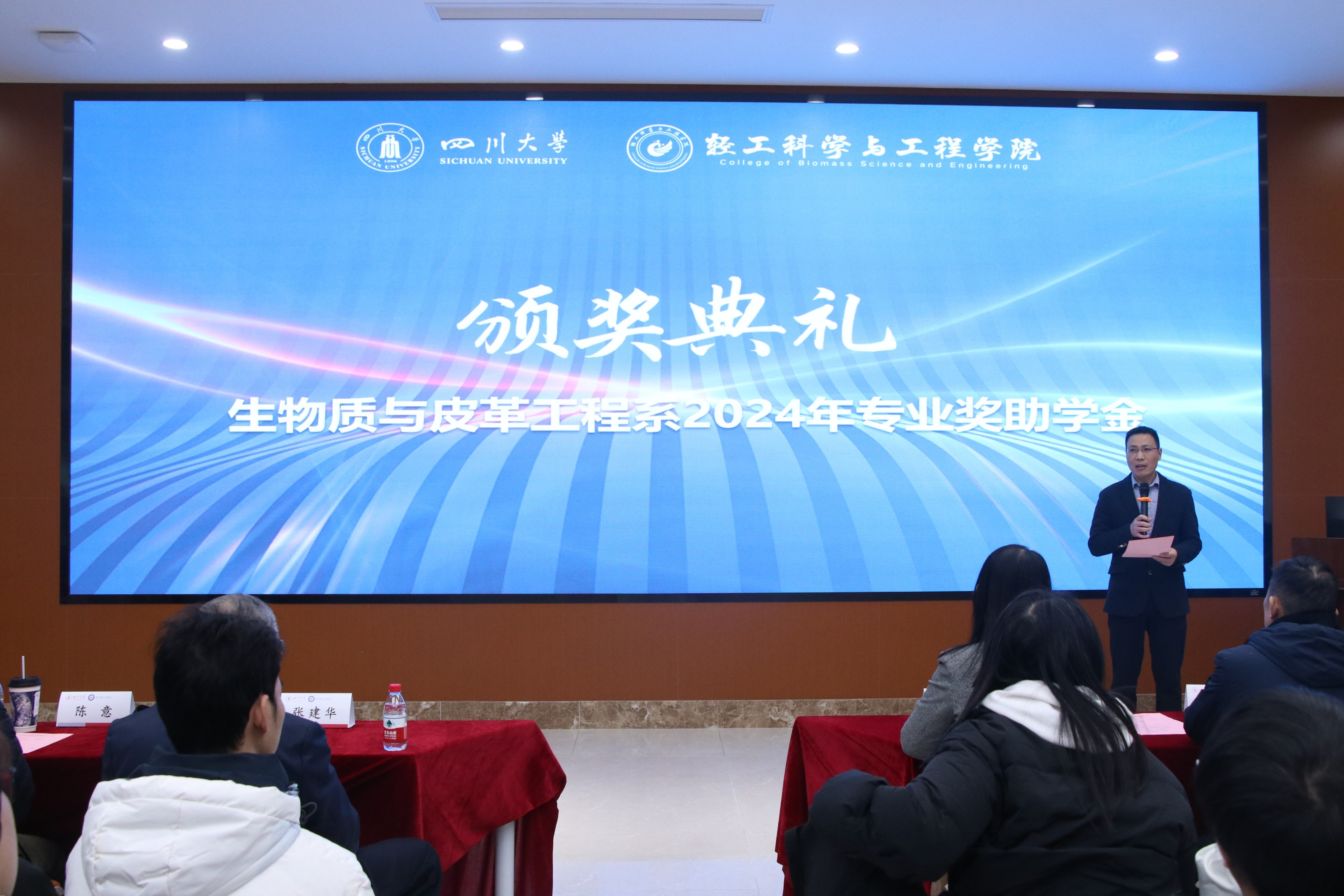 2024�12�13日下午,四川大学生物质与皮革工程�2024年专业奖助学金颁奖典礼在皮革楼互联网中心隆重举行。出席本次颁奖典礼的领导与嘉宾有中国皮革协会秘书长张燕女士,德国司马化学有限公司皮革部中国区总经理张建华先生,斯塔尔精细涂料有限公司-斯塔尔学院中国区经理夏敏先生,斯塔尔精细涂料有限公司-斯塔尔中国区皮革部业务经理康海生先生,轻工科学与工程学院李天富书记、副院长陈意教授,生物质与皮革工程系副系主任程海明教授、副系主任吴重德教授。颁奖典礼由学院党委副书记冯国涛副教授主持�