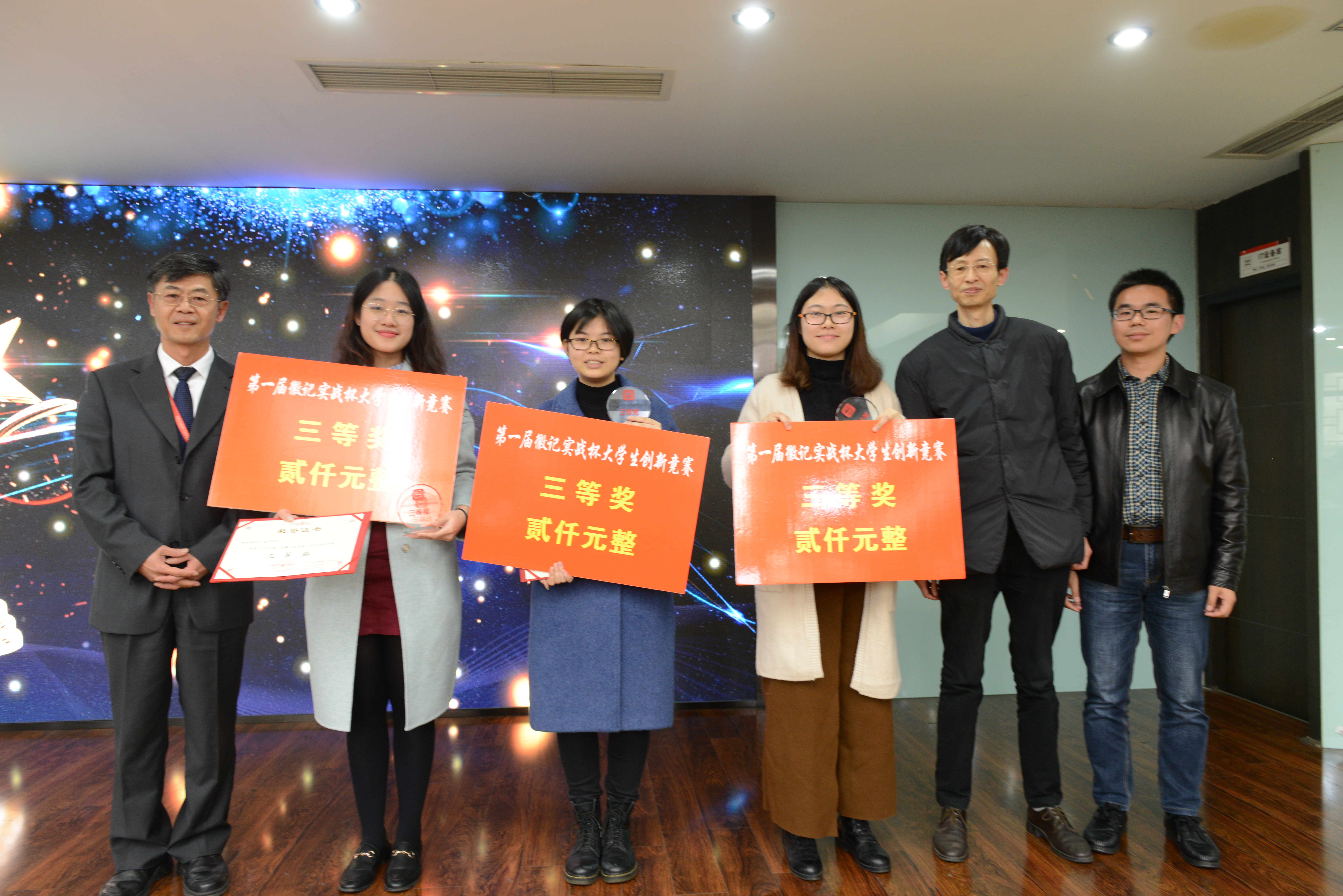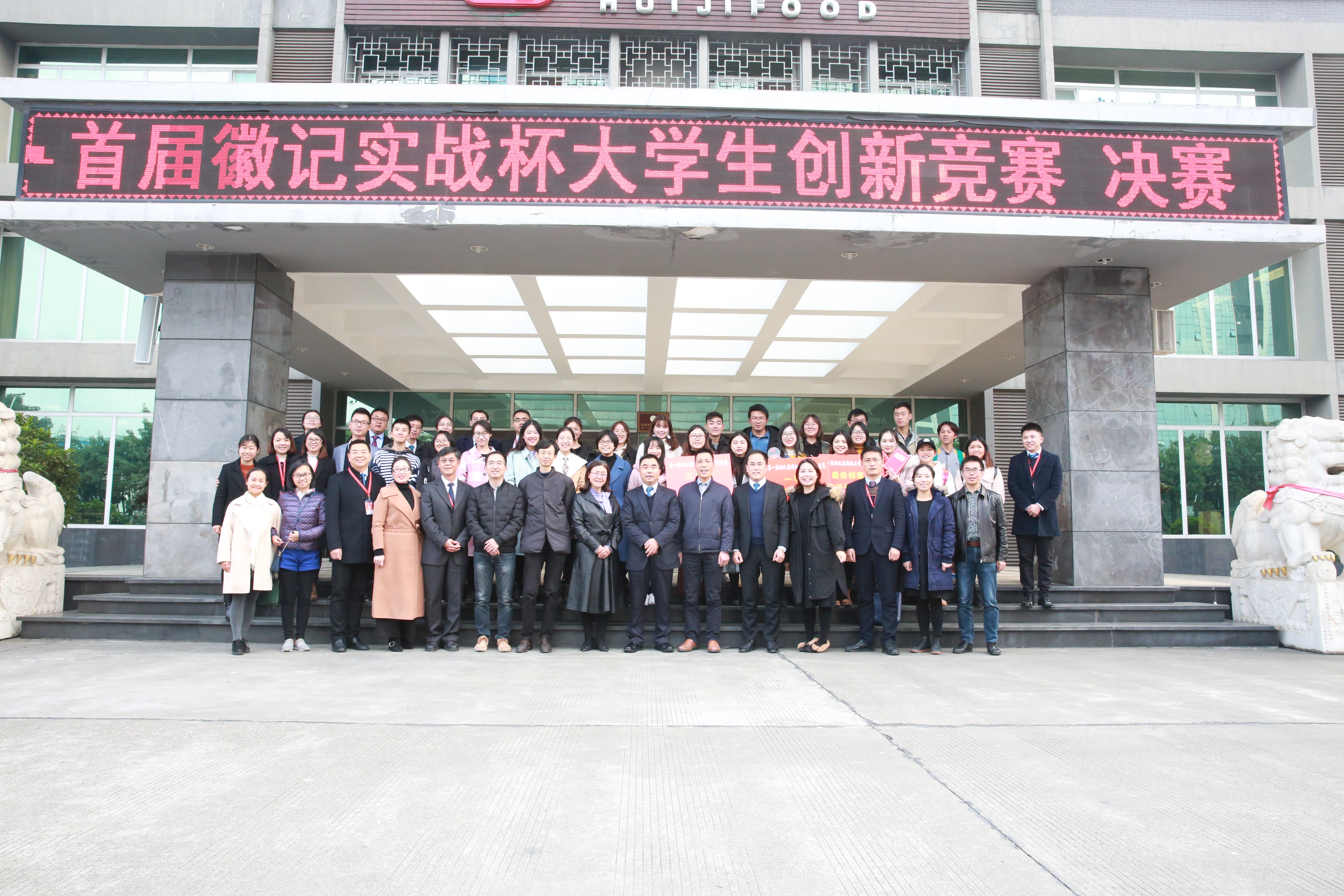 徽记股份有份有限公司董事长吕金刚先生和轻纺与食品学院冯国涛副书记先后为决赛致辞;在主持人介绍了入围决赛的队伍�比赛规则、评分细则以及奖项设置后,入围队伍进行了作品展示�经过激烈角逐,首届“徽记实战杯”大学生创新竞赛决赛结果顺利出炉�