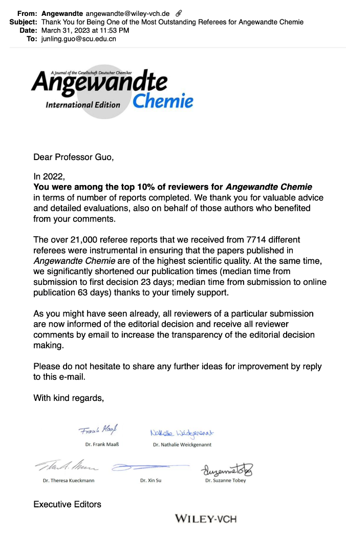 近日获悉,我院生物质与皮革工程系郭俊凌教授荣获国际著名化学期刊《德国应用化学》(Angewandte Chemie)颁发的2022年度杰出审稿人奖(Outstanding Referee)。《德国应用化学》是德国化学学会(Gesellschaft Deutscher Chemiker, GDCh)官方期刊,出版范围涵盖了化学研究的各个领域且持续保持领先地位,目前已成为世界化学领域最具学术影响力和品牌影响力的期刊。