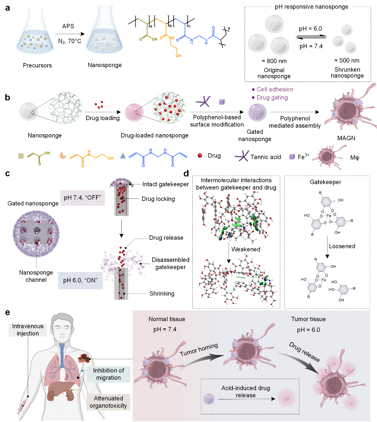 近日,郭俊凌教授团队开发了一种由金属多酚网络构建的纳米多孔门控系统,用于控制微凝胶的药物释放,并将其与巨噬细胞结合,构建了对肿瘤具有靶向富集和药物递送的细胞治疗系统,称为MAGN,该研究成果发表于国际顶级期刊《Advanced Science》(影响因子17.5)。研究基于纳米海绵丰富的孔隙结构和pH响应功能等物理化学特性、多酚与金属离子在纳米海绵表面自组装形成具有分子门控系统,结合巨噬细胞对肿瘤具有靶向富集作用,从而提出了药物封堵和药物递送的新型策略(如图)。该研究发现,在不影响巨噬细胞活性和正常迁移侵袭能力的前提下,MAGN能够携带高剂量抗癌药物DOX富集在肿瘤微环境中更有效地杀死肿瘤细胞,抑制肿瘤生长。MAGN输送DOX至肿瘤部位的效率是游离DOX的三倍,并证实了MAGN的体内安全性。