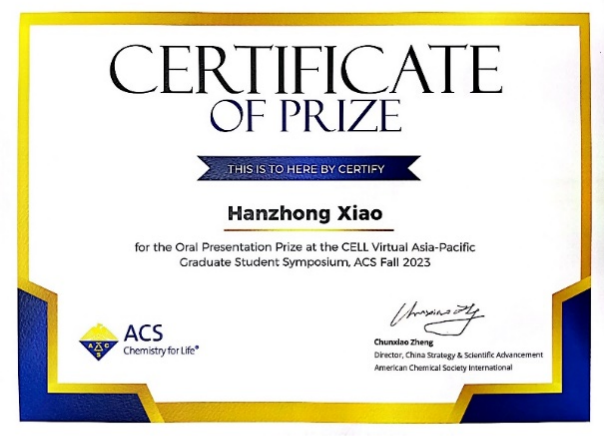 2023年8月13-17日,由美国化学会举办的ACS 2023秋季年会在美国旧金山以线上、线下结合的方式顺利召开。我院石碧院士课题组黄鑫研究员指导的2021级博士研究生肖涵中在亚太纤维素和再生材料学生分会场做口头报告,并获得优秀报告奖。