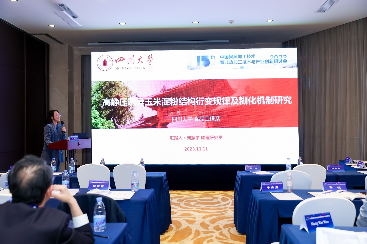 在食品科技领域的前沿研究水平。金垚副教授和刘振宇博士在食品非热加工分论坛分别基于正渗透的全过程冷加工果汁高倍浓缩技术、超高压技术糊化玉米淀粉机制方面做精彩报告。卢云浩特聘副研究员在果蔬加工与品质分论坛就郫县豆瓣微生物协同代谢与风味品质提升方面做精彩报告。