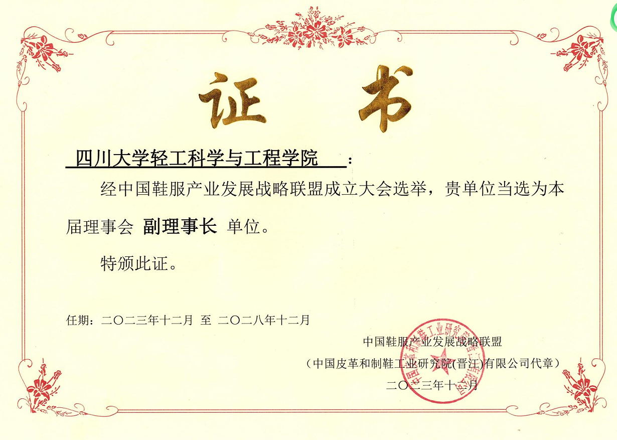 2023年12月16日,中国鞋服产业发展战略联盟在福建晋江揭牌成立。该联盟共吸引了56家成员单位的加入,其中包括企业37家,科研院所6家,高校13家。经大会选举,我院与华南理工大学、安踏(中国)有限公司、海西纺织新材料工业技术晋江研究院四单位当选为中国鞋服产业发展战略联盟第一届理事会副理事长单位。