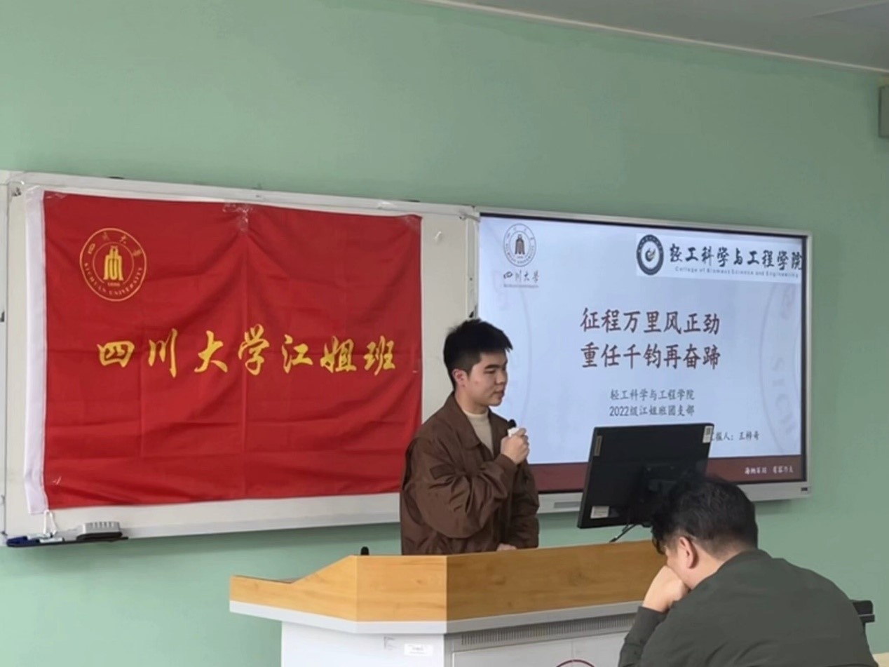 接下来,江姐班班长王梓奇以“忆征程 奋千里 赴科研”为主题向老师和同学们作主题汇报。王梓奇向各位老师介绍了2022级103班江姐班的基本情况,并概述了江姐班在过去一年中举办和参与的各项活动,随后向各位老师介绍了本学期3-6月江姐班的整体规划,通过轻传承、轻宣讲、轻征程、轻科研、轻关爱、轻志愿等落实落细江姐班“321”建设实施方案。