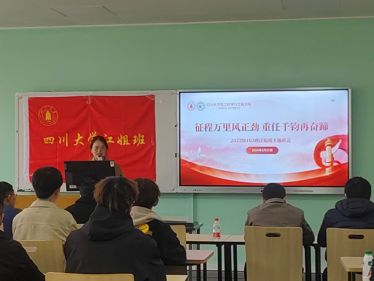 2022级103班江姐班在江安校区综合楼B510开展了新学期“征程万里风正劲 重任千钧再奋蹄”的主题班会活动暨导师见面会。本次主题班会邀请到学院党委副书记冯国涛副教授,班主任周加境特聘研究员以及李国英教授、但年华副教授、谭淋副研究员、肖霄副研究员等参加指导,103班全体同学参与。主题班会由学院学生事务办公室主任、2022级辅导员贺婷老师主持。