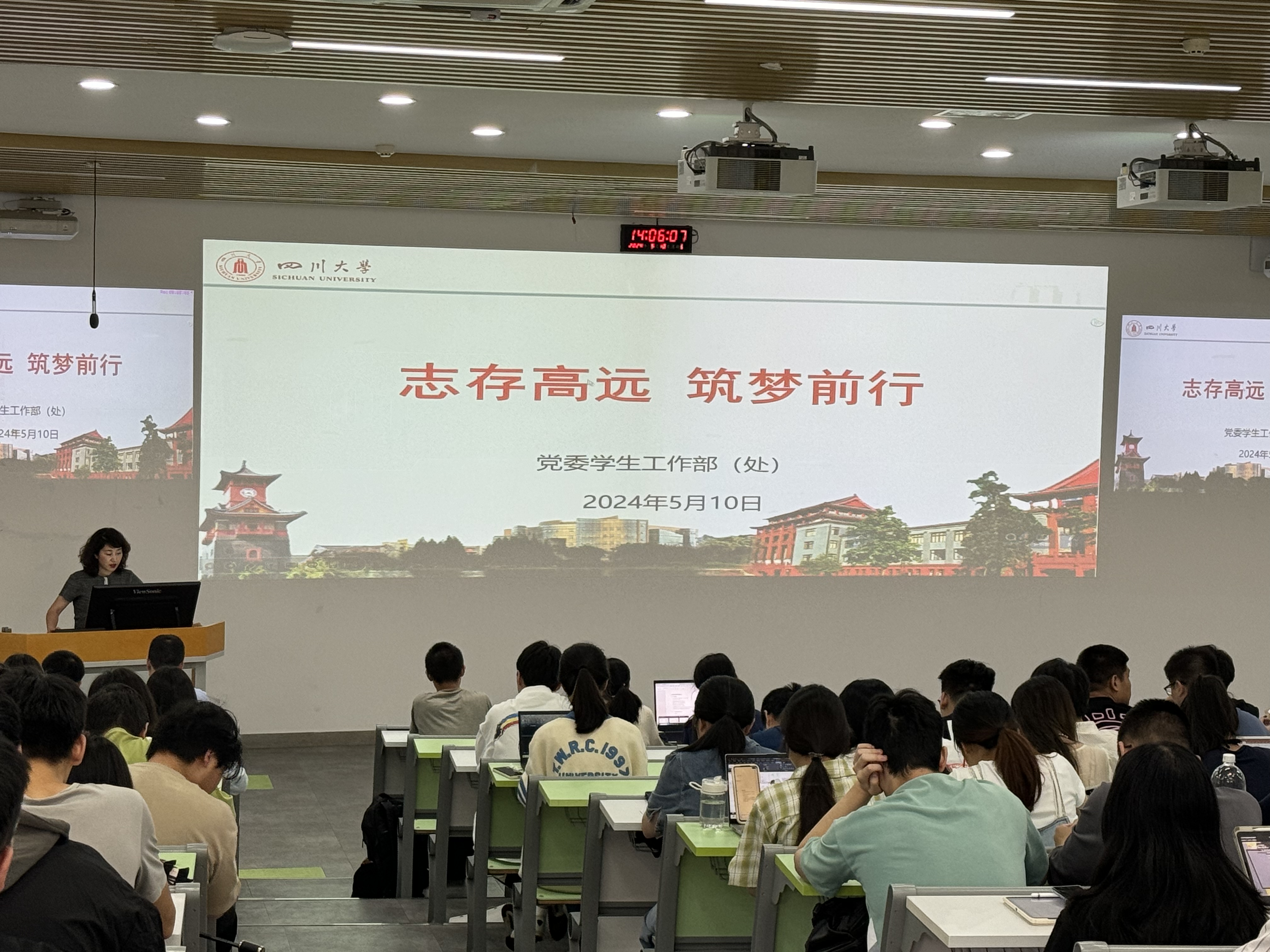 紧接着,学工部黄菲娅副部长为同学们开展了主题为“志存高远,筑梦前行”的深造专题报告。黄部长首先分析了当前就业形势下继续深造提升学历对于高质量就业的提升,随后进一步针对保研、留学、考研形势以及各个时间节点同学们应该如何准备进行了规划,最后鼓励同学们在大三这个重要的时间节点尽早做好生涯规划,达到自己的目标。