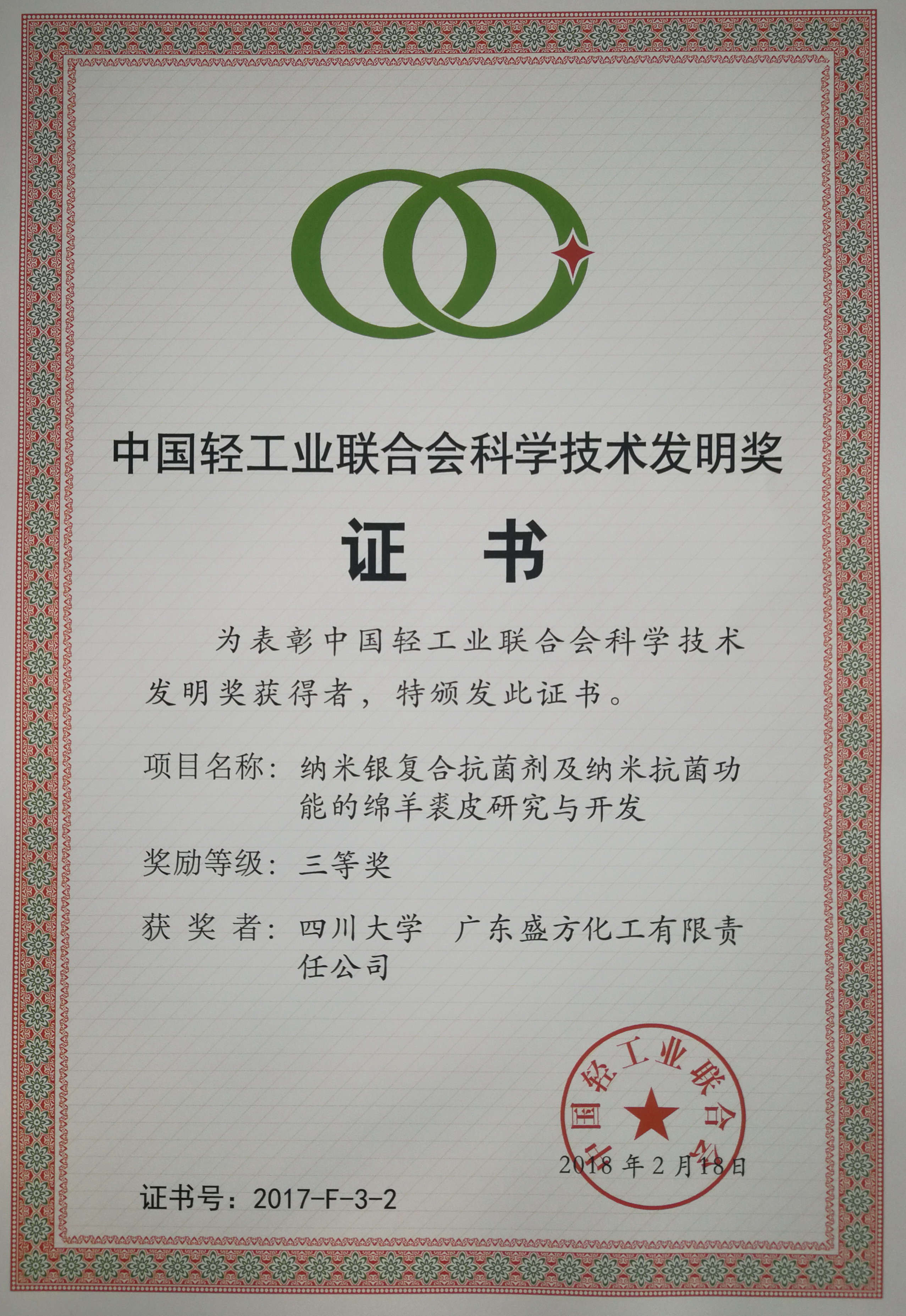 陈武勇、周晋、张金伟、杨威特和王瑶,广东盛方化工有限责任公司孙宏斌等完成的 “纳米银复合抗菌剂及纳米抗菌功能的绵羊裘皮研究与开发”荣获中国轻工业联合会科学技术发明奖三等奖。中国轻工业联合会科学技术奖延续原轻工业部科技奖,属于可推荐国家级奖励的省部级奖,奖项与国家级奖一致,设科学技术发明奖和科学技术进步奖,每年评奖一次,奖励对我国轻工业科技进步、经济社会发展、轻工业行业现代化建设做出较大贡献的科学技术人员和组织。其奖励范围与我院的皮革、食品、发酵等专业或专业方向密切相关,2018年中国轻工业联合会科学技术奖励工作将在4月份启动。