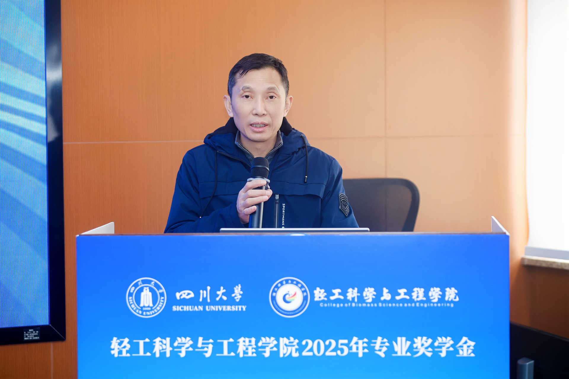 11�28日下午,轻工科学与工程学�2025年专业奖学金颁奖典礼在皮革楼互联网中心举行。中国皮革协会副理事长陈占光、德国司马化学有限公司皮革部中国区总经理张建华、斯塔尔精细涂料有限公司皮革事业部中国区区域销售经理涂刚、天津春发生物科技集团有限公司项目经理董婷等企业嘉宾,学院党委书记李天富、院长彭必雨,副院长周建飞、迟原龙等院领导,生物质与皮革工程系系主任林炜、副系主任程海明,食品工程系系主任吕远平等,与全体获奖师生共同参加典礼。学院党委副书记姜新主持�