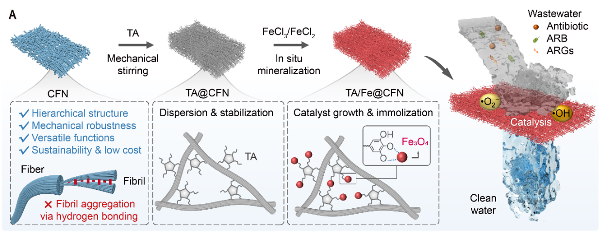 随着全球人口增长与制药业快速扩张,废水中抗生素等新兴污染物的检出频率与浓度不断攀升。这类污染物具有显著的环境持久性,难以通过自然过程实现有效降解,即便在痕量浓度下,仍会诱导微生物产生耐药性,对生态系统安全与公共健康构成严重威胁。活性炭吸附、紫外线消毒等传统污水处理技术,因对这类难降解污染物的去除效率有限,难以满足实际处理需求。当前研究中,芬顿法等高级氧化技术虽可通过生成活性氧(reactive oxygen species, ROS)实现此类污染物的降解,但这类技术往往需在反应体系中投加大量化学药剂,且存在活性成分寿命短、催化剂易团聚失活等问题,导致反应效率与处理经济性受限。纳米限域催化膜(nanoconfined catalytic membranes, NCM)的出现为破解这一难题提供了新思路:该类膜材料通过将纳米催化剂限域于多孔基体中,不仅能有效抑制催化剂团聚,还可强化 ROS 与污染物的界面相互作用,从而实现污染物的连续高效去除。然而,纳米限域催化膜的规模化应用仍面临诸多挑战:其一,复杂的制备工艺与高昂的生产成本,限制了其实际推广;其二,传统聚合物基 NCM 易出现孔道堵塞、催化剂流失等稳定性问题,且其石油基材质也带来了环境兼容性与可持续性方面的深层担忧。