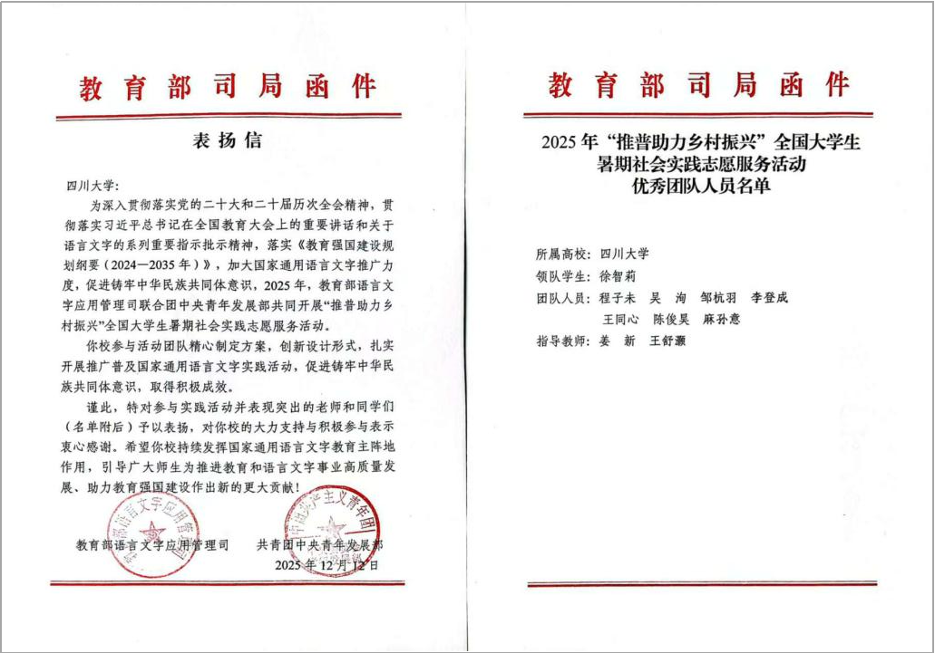 近日,教育部语言文字应用管理司、共青团中央青年发展部向我校发来表扬信,我院“千纸鹤”支教队(“索玛花开伴学路,纸鹤传音绘振兴”团队)凭借扎实的实践成效,成功获评2025年“推普助力乡村振兴”全国大学生暑期社会实践志愿服务活动“优秀团队”,系全校仅有的两支获此殊荣的队伍之一。