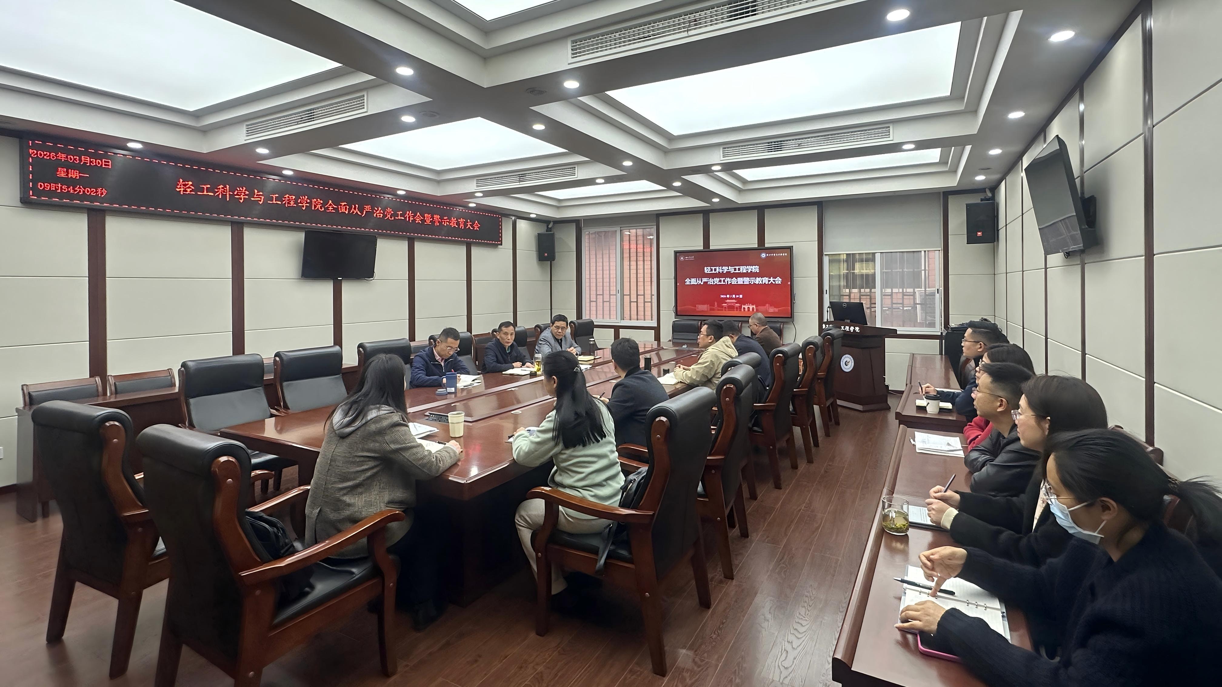 3月30日上午,学院在望江校区纺工附楼205会议室召开2026年度全面从严治党工作会暨警示教育大会。学院党委书记李天富主持会议并讲话,学院班子成员、两委委员、专职组织员、科级干部、教职工党支部书记等参加会议。