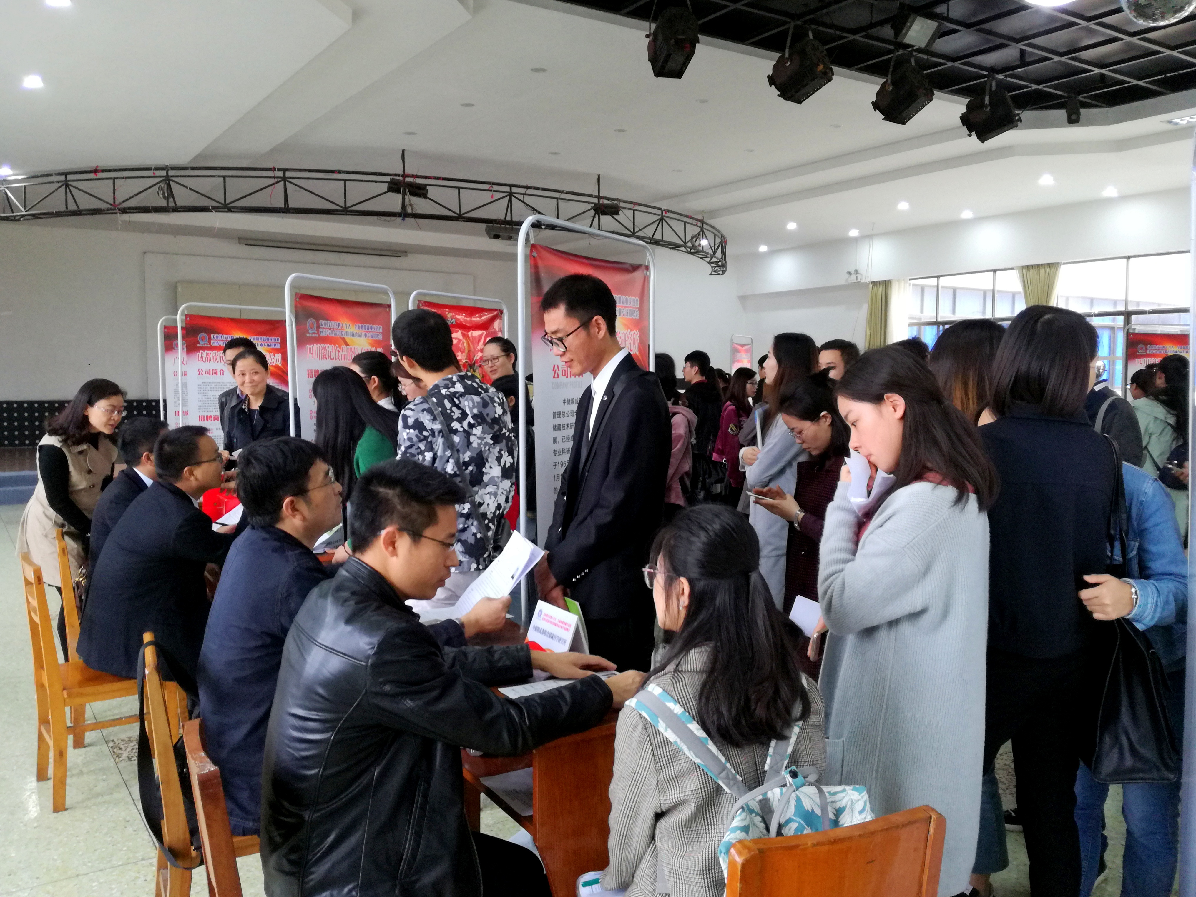 本次专场招聘会共邀请中储粮成都粮食储藏科学研究所、四川郫县豆瓣股份有限公司、四川金宫川派味业股份有限公司、四川徽记食品股份有限公司、四川旌晶食品有限公司等29家食品行业用人单位前来我校进行招聘。近300名成都地区各高校食品等相关专业的2018届毕业生到场应聘。招聘会现场,毕业生对各意向单位进行简历投递和现场交流,进一步了解企业营运状况及招聘需求。来到此次招聘会的不仅有2018届毕业生,还有部分其他年级在校学生前来观摩学习。