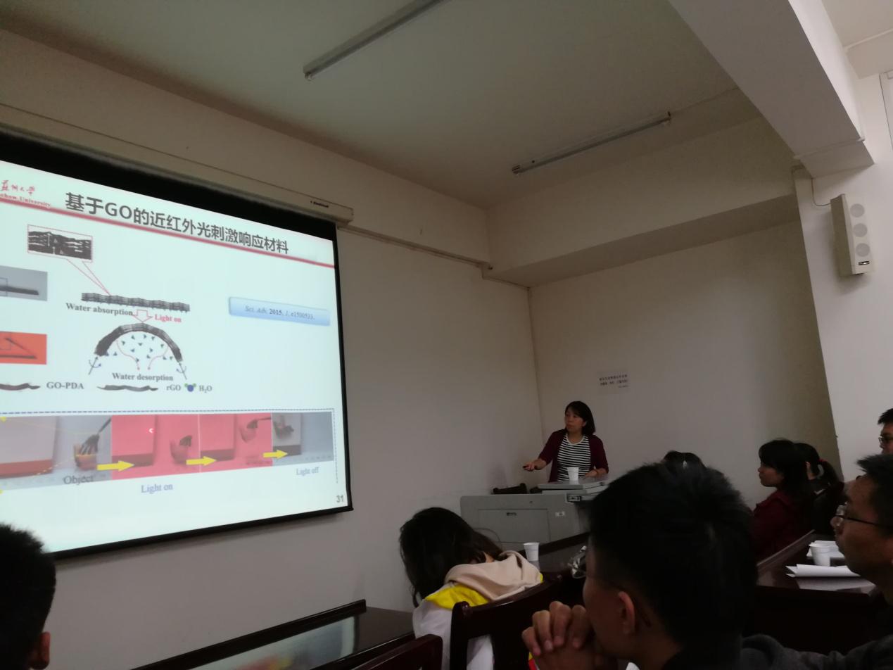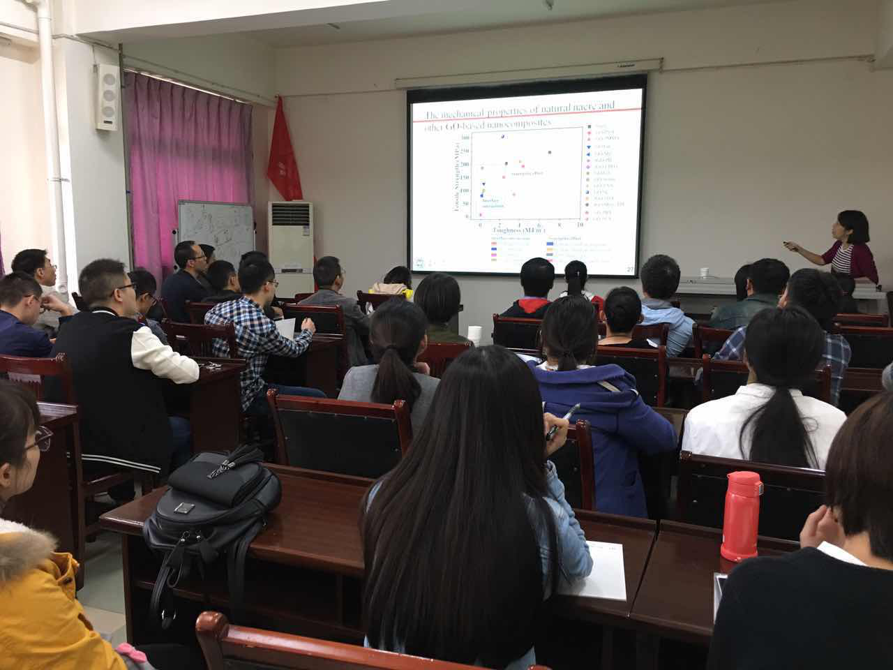 ,在南京大学获高分子化学与物理博士学位,并先后在香港理工大学和宾夕法尼亚大学从事博士后研究和担任访问学者,她的研究兴趣在于石墨烯/高分子功能材料和具有微/纳结构的导电高分子等领域。杨晓明副教授从石墨烯的历史、石墨烯复合物结构的设计及应用等方面开展讲座,报告了她在氧化石墨烯/聚合物层状结构材料的设计、制备及其近红外光响应研究的最新研究结果。杨晓明老师的报告幽默风趣,内容深入浅出,激起了在座老师和学生的浓厚兴趣。讲座期间,师生踊跃发言提问,通过与杨晓明老师面对面的交流,拓宽了我院师生的研究视野。