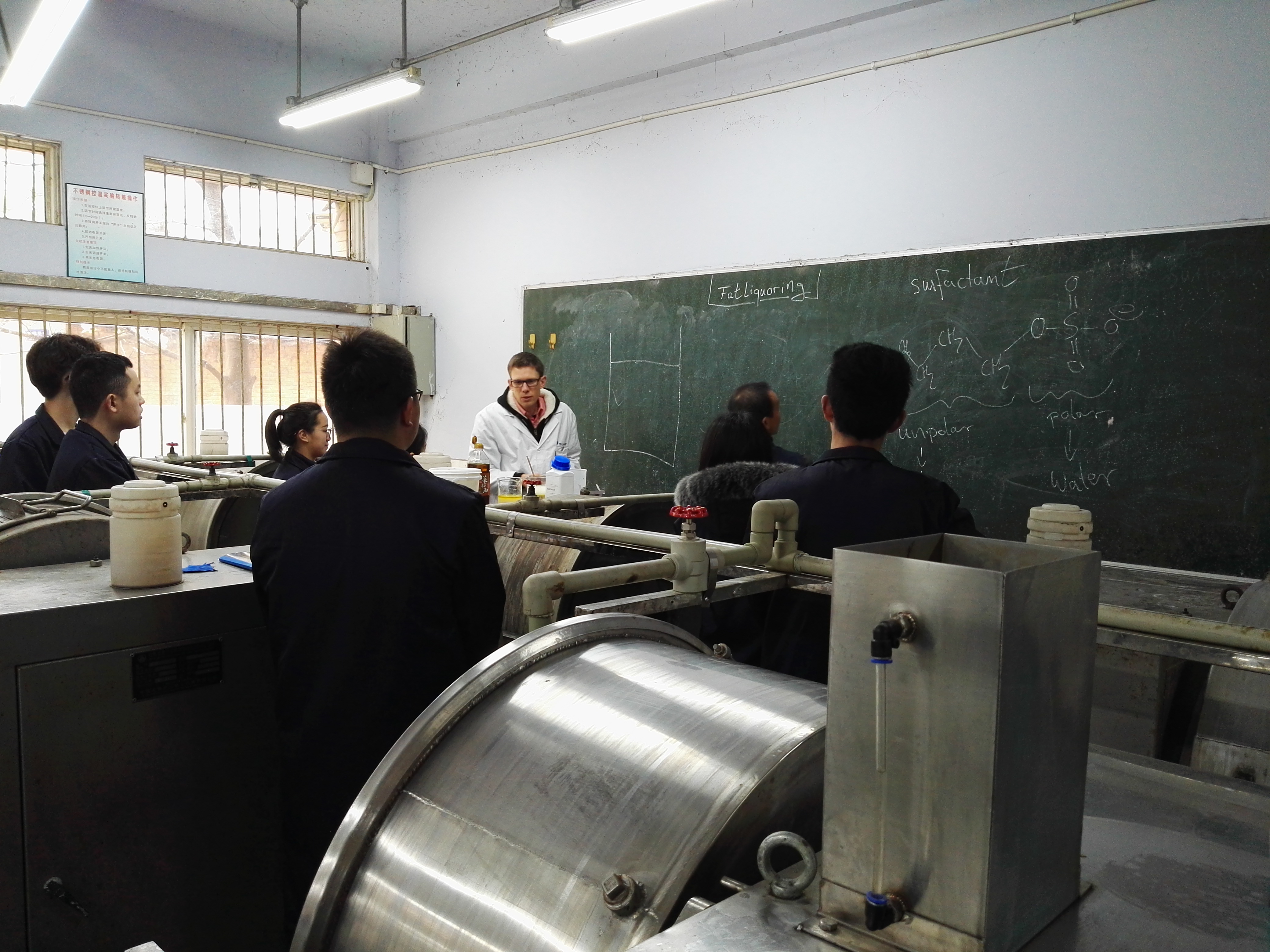 制革技术培训班”历时7天,培训内容从原料皮到成革的涂饰,培训方式为理论授课和现场实践相结合。培训期间,汤普勒德国产品交流和推广经理Dr.Jeffry Guthrie-Strachan,汤普勒西班牙研发专家Miss Laura以及汤普勒德国研发专家Dr.Benjamin Autenrieth分别给学生们讲解制革相关工序(前处理,复鞣,染色加脂以及涂饰工段)工作原理以及材料结合机理。在培训制革工序的实际操作流程中穿插理论讲授,通过幻灯片演示,现场作图或直接示范等一系列配合,帮助学员们快速的理解和掌握要点。整个过程中,汤普勒团队配合现场教师团队,实现了一次以交流和分享为主旨的别具一格的培训。