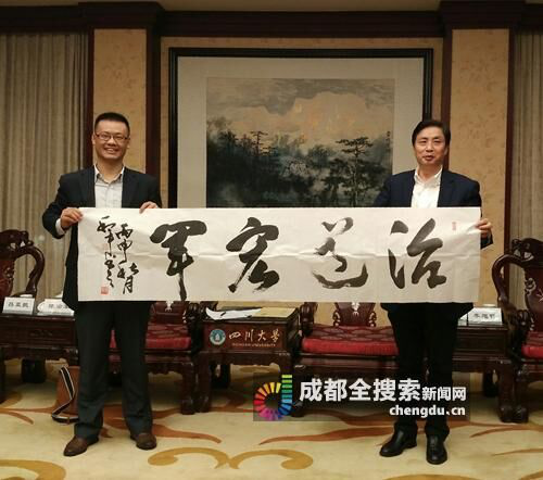 校长谢和平院士亲手书写了书法赠与陈治军。他表示,校友的捐赠,可以进一步给学校研究团队提供支撑,尤其是创业校友,更有互补共赢性。他还透露,日后川大可以和徐州联合起来,达成校市合作协议,推动大学和地方产业之间的联系。