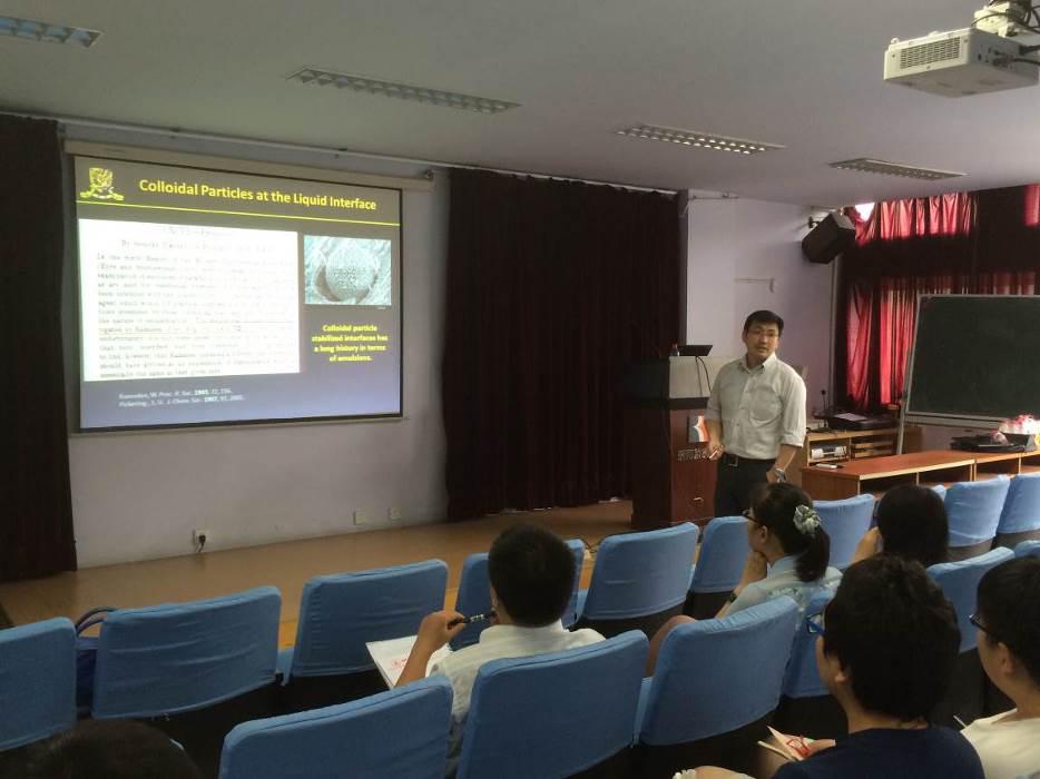 轻纺与食品学院邀请,香港中文大学化学系魏涛教授于2015年7月1日在我院访问,并在皮革楼2楼学术报告厅为我院师生作了一场题为“Liquid Marbles: Properties and Applications”的学术报告。报告会由轻纺与食品学院院长何有节教授致欢迎辞,生物质与皮革工程系副系主任林炜教授主持。魏涛教授在报告中对Liquid Marbles的制备原理与方法、独特性质及其作为微型反应器在不同领域的用途等方面的研究工作及最新进展做了详细的介绍。魏涛教授的报告紧抓国际学术前沿研究,内容新颖,讲解深入浅出、思路清晰,激起了聆听报告师生的浓厚兴趣。报告结束后,魏涛教授与学院部分师生进行了交流和讨论。魏涛教授于2003年获香港中文大学化学系化学博士学位,2003年-2005年在德国巴斯夫公司任职,2005年7-12月在美国明尼苏达大学做博士后研究,2006年1月起在香港中文大学化学系任教。目前主要研究领域包括:高分子、胶体粒子和软物质的设计和合成及其相互作用研究等。魏涛教授近年在Angewandte Chemie International Edition、Chemical Communications、Macromolecules、Soft Matter和Langmuir等国际核心学术刊物发表论文80余篇。