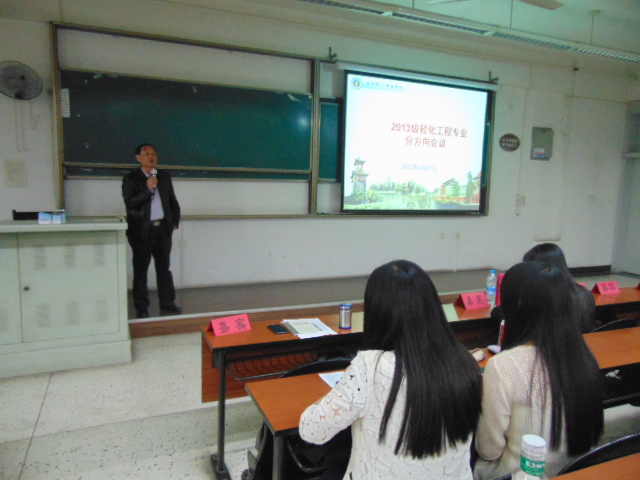 江安校区第一教学楼B座302室顺利举行。本次宣讲大会的主要嘉宾有院长、生物质与皮革工程系系主任何有节教授,生物质与皮革工程系副系主任彭必雨教授,革制品教研室徐波主任、杨璐铭副教授、周晋老师,院团委书记、2013级辅导员苏德强老师以及两名来自2012级轻化工程设计方向的学生代表。我院2013级轻化工程专业全体同学参与了本次大会。下午三点五十分,宣讲会正式开始。首先,彭必雨老师对轻化工程专业各方向的课程进行了详细阐述,并向同学们介绍了专业分方向工作、实践与国际教学周安排、创新实践及科研训练分组以及具体的志愿填写和分配原则方案等内容。紧接着,徐波老师为同学们介绍了有关革制品设计方向的办学概况,并提到专业设计的研究范畴主要为“外观、结构、功能”三大类。在讲解之余,他以图片的形式为大家展示了历届学生优秀的设计作品以及轻化工程专业的对外交流情况,使同学们加深了革制品设计方向的了解。在随后进行的师生交流环节中,在场同学向老师们提出了有关专业方向的疑问,杨璐铭老师和周晋老师就革制品设计方向在学科安排、实践内容等各方面的问题做出解答。在交流环节过后,何有节院长针对国内皮革公司的概况以及各届轻化工程就业情况做出分析和讲解,向同学们提出了关于专业方向选择的建议以及“学者无他,学做人而已”的期望。下午五点三十分,宣讲大会正式结束。我院轻化工程专业分为制革及革制品设计两大方向,本次分方向工作将于四月中旬开展。本次大会旨在向2013级的同学们做出专业方向的选择指导,不仅使同学们对轻化工程两大方向有更深入的了解,对“选择什么”、“怎样选择”等问题有更全面的认识,同时还有利于促进同学们明确大三、大四的学习生活方向和目标,对专业道路慎重地做出选择和规划。